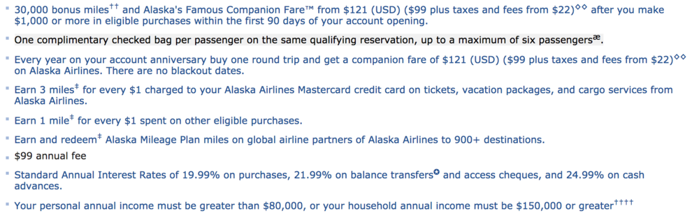 Now, the MBNA Alaska Airlines World Elite MasterCard offers 30,000 bonus miles if you spend $1,000 in the first three months, with an annual fee of $99. You can still get a $60 rebate through Great Canadian Rebates, making your net cost $39 for the first year.