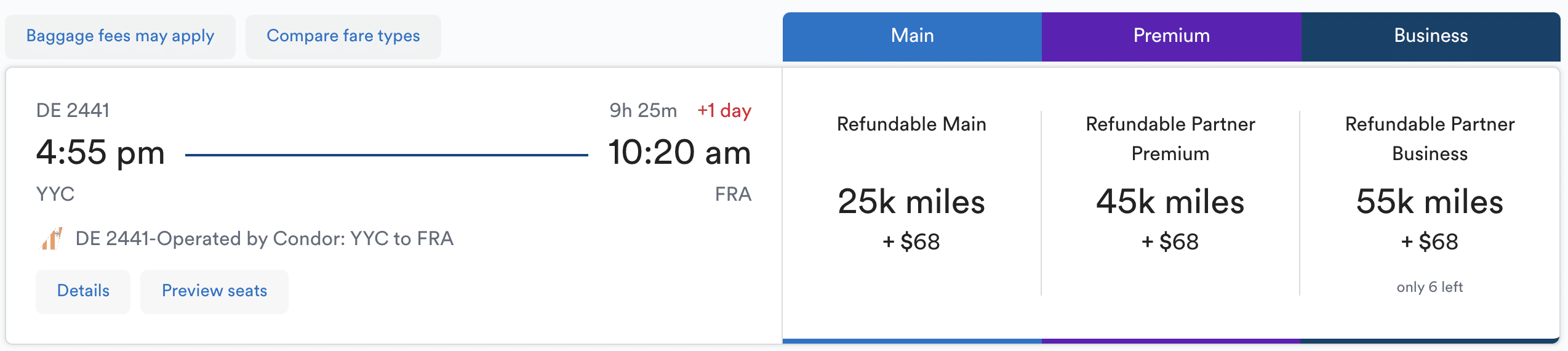 - DE2441 Calgary (YYC) to Frankfurt (FRA), departing 4:55pm and arriving 10:20am the next day