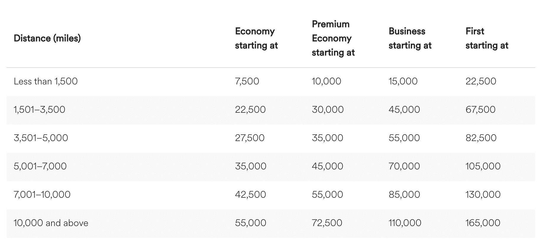 - Premium economy: 45,000 miles