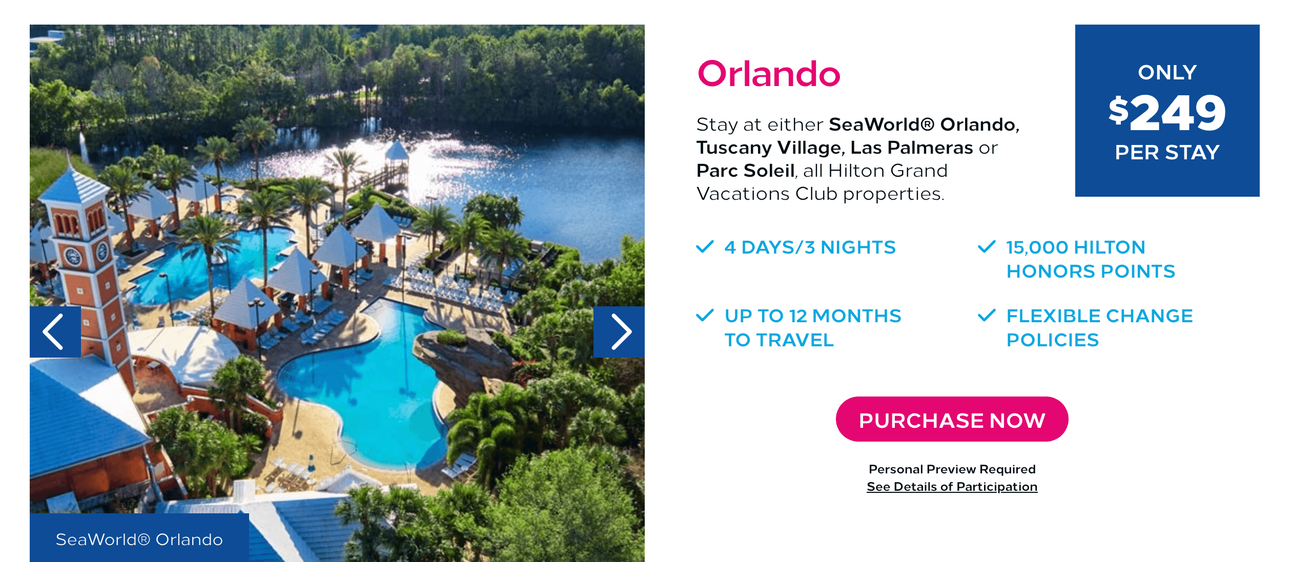 One option that many people don’t consider is booking a timeshare presentation package. Most big hotel chains have a timeshare ownership program; for example, Marriott has its Marriott Vacation Club and Hilton has its Hilton Grand Vacations. They offer some great packages, where you pay a nominal fee for several nights at a timeshare resort in exchange for a 1.5-to-2-hour presentation.