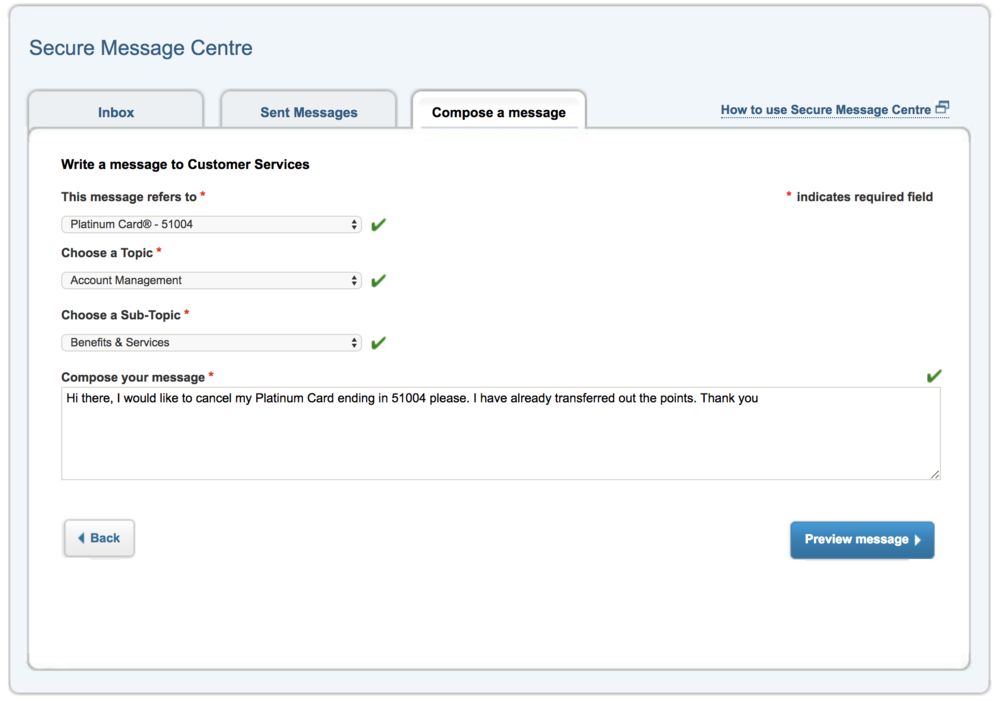 Secure Message retains the benefit of convenience, especially since you can just fire off a message and forget about it until you receive a response. The downside, of course, is that the help process tends to be much slower, since you’re basically exchanging emails with the agents. Moreover, it doesn’t help that sometimes the agents will respond to you with rather inane boilerplate messages, like responding to your card cancellation request with “Are you sure? You will forfeit the 56 Membership Rewards points left in your account.”