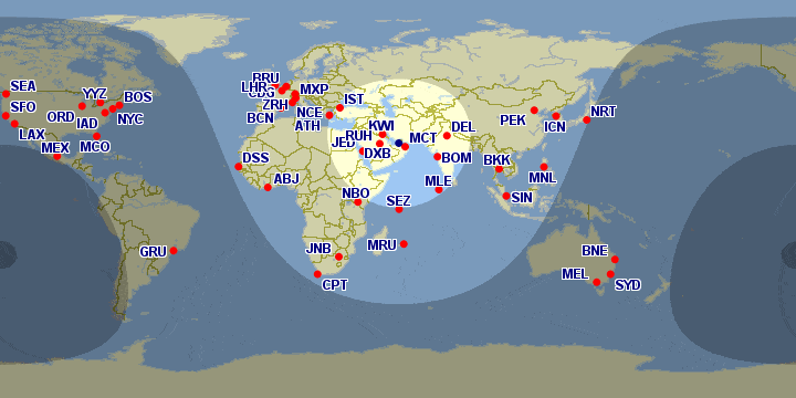 From Dubai, there are a number of cities in the Middle East, Eastern Africa, and the Indian Subcontinent that fall within the first band.