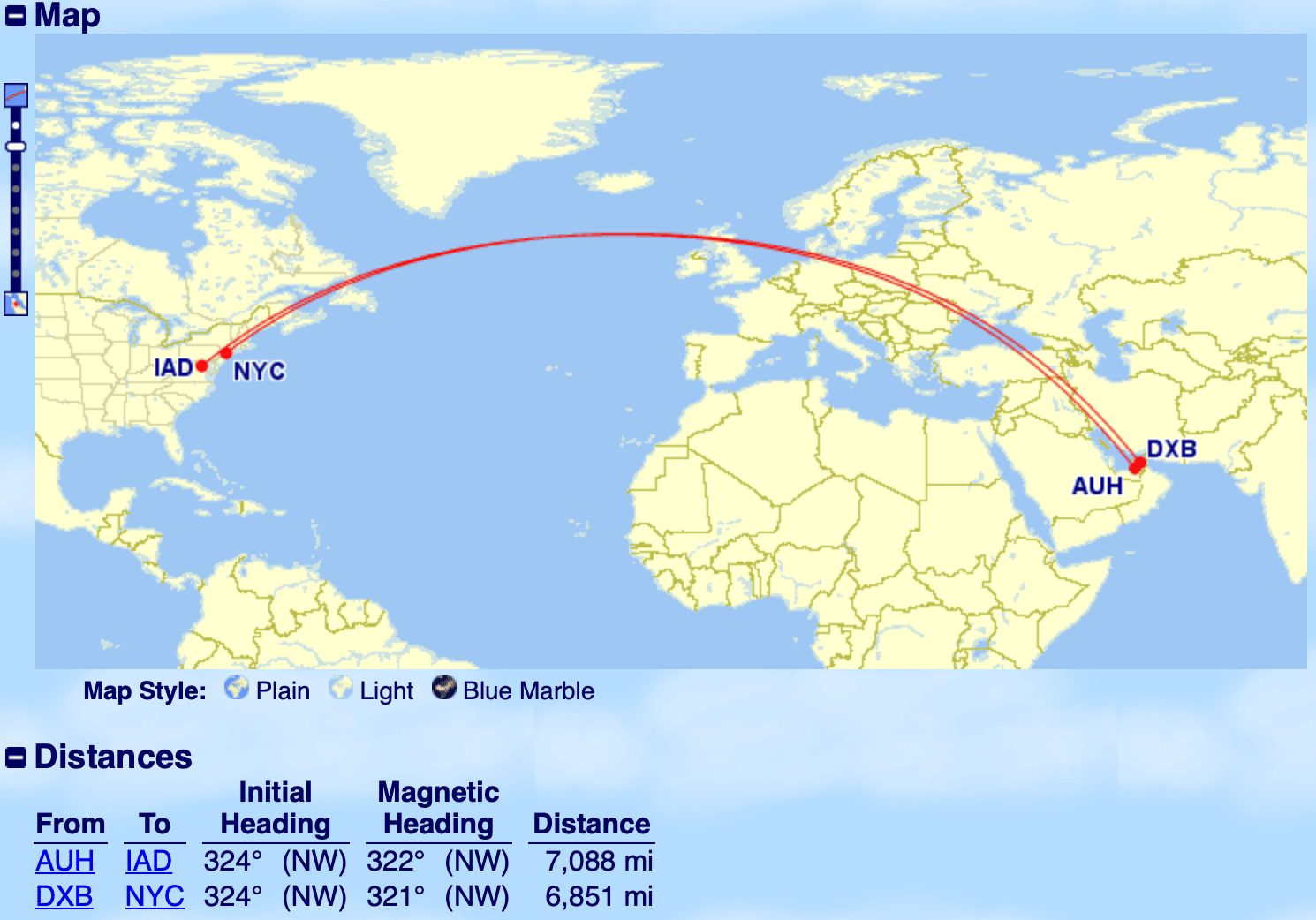 For another example, let’s consider two similar routes: Etihad Airways First Class from Abu Dhabi to Washington, and Emirates First Class from Dubai to New York.