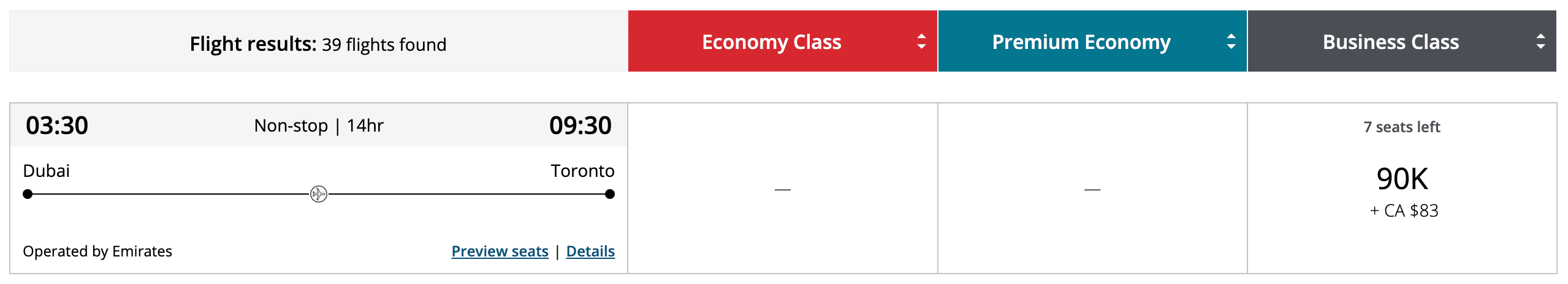 (While this is more than the 85,000 Skywards miles it would cost for the same flight, keep in mind that Aeroplan points are arguably much easier to come by, especially from a Canadian perspective.)