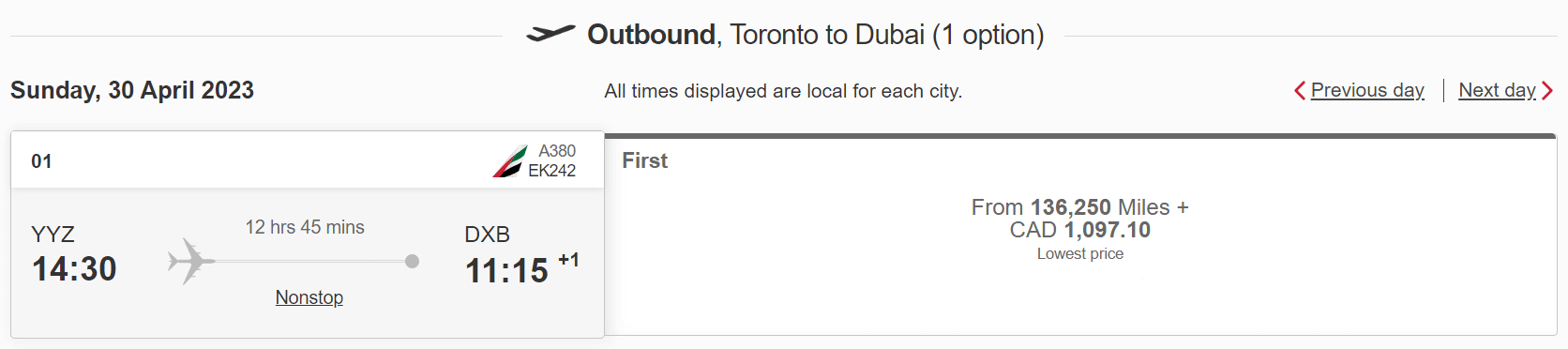 So, while a flight from Toronto to Dubai might cost 136,250 Skywards miles and $1,097 (CAD) in taxes and fees: