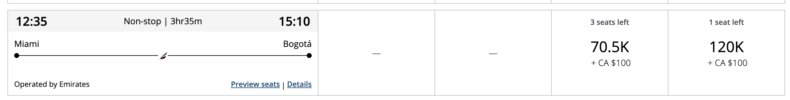- Miami–Bogotá: 120,000 Aeroplan points + $99.40 CAD