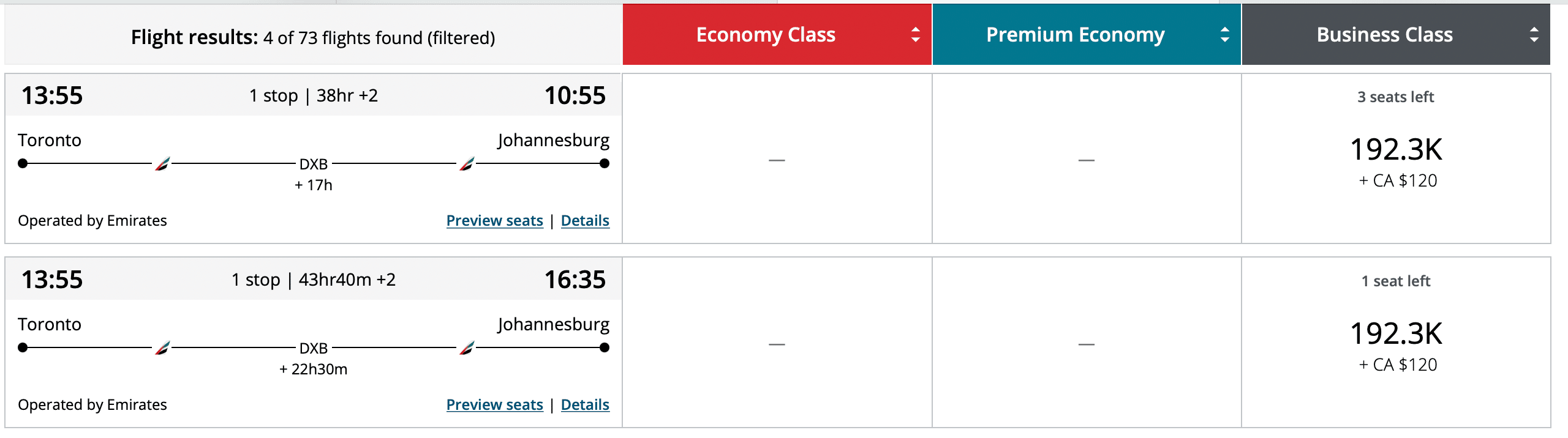 The same is true when flying from Toronto to Johannesburg via Dubai with Emirates. This flight routing, which measures just shy of 10,900 miles, prices out at 192,300 Aeroplan points in business class exclusively with Emirates.
