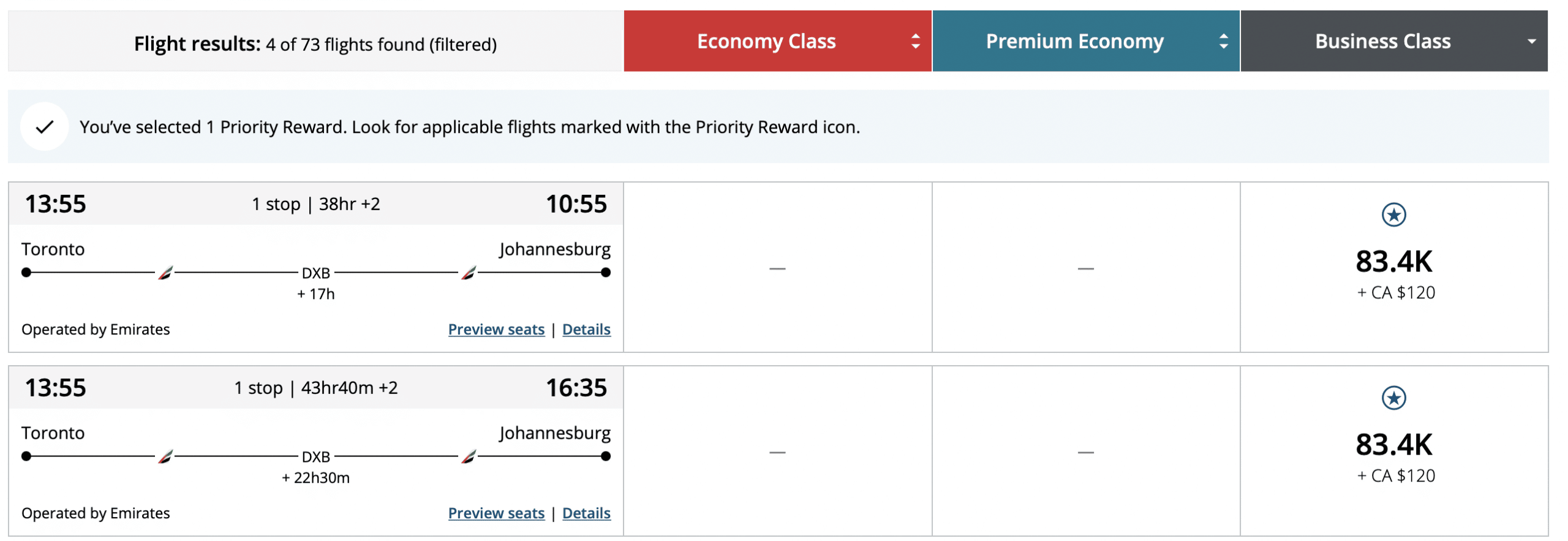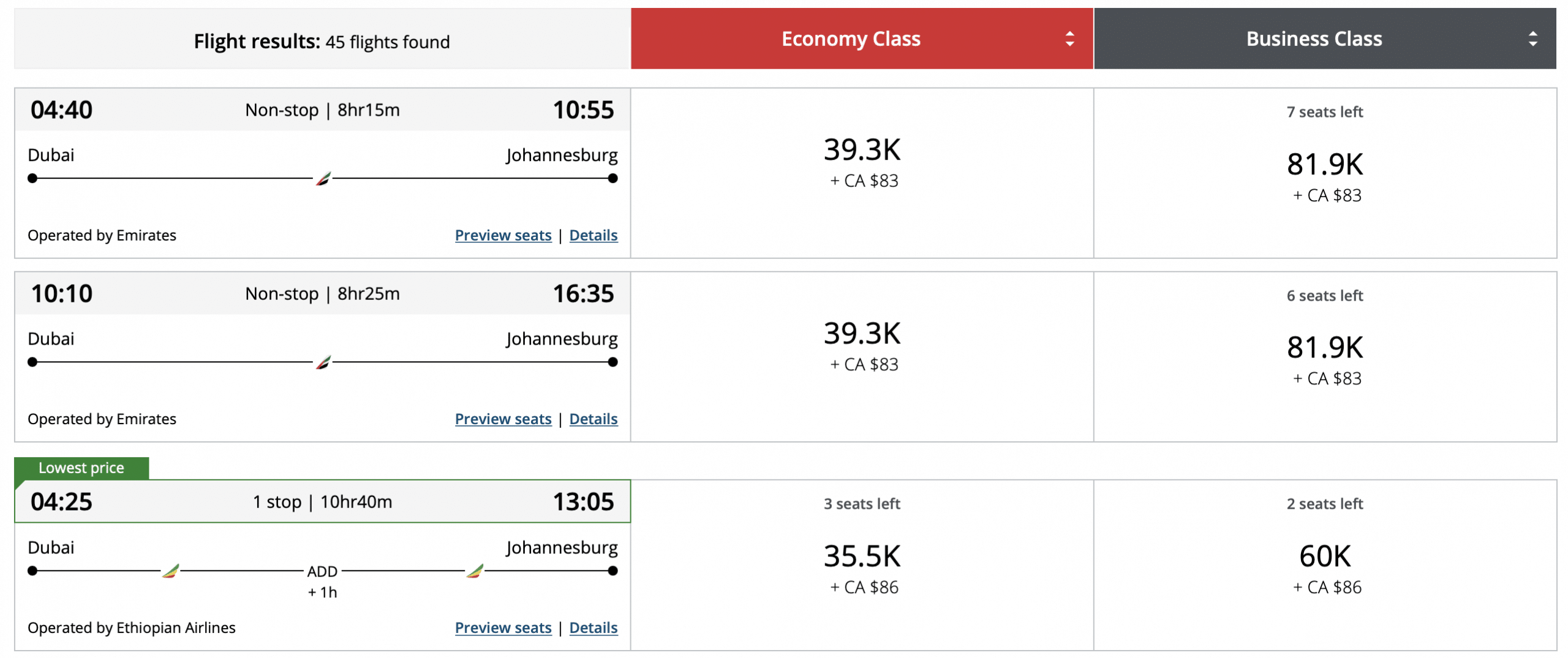 Next up, let’s take a look at a one-way flight from Dubai to Johannesburg. The current pricing comes in at 39,300 Aeroplan points in economy and 81,900 Aeroplan points in business class.