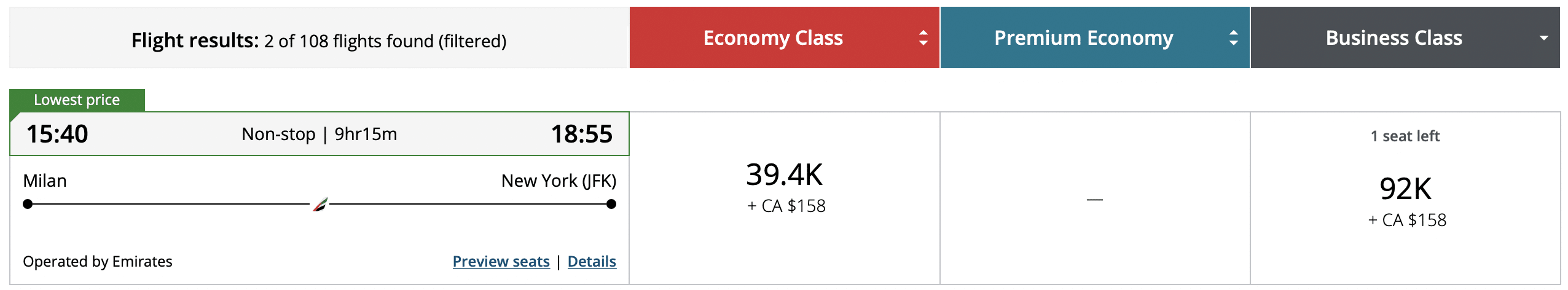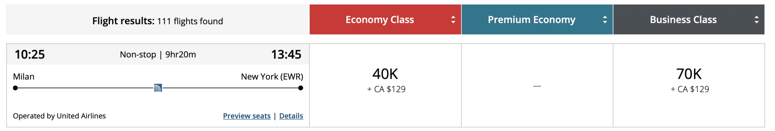 By comparison, a one-way flight from Milan to New York (EWR) with United comes out at 40,000 points in economy or 70,000 points in business class.