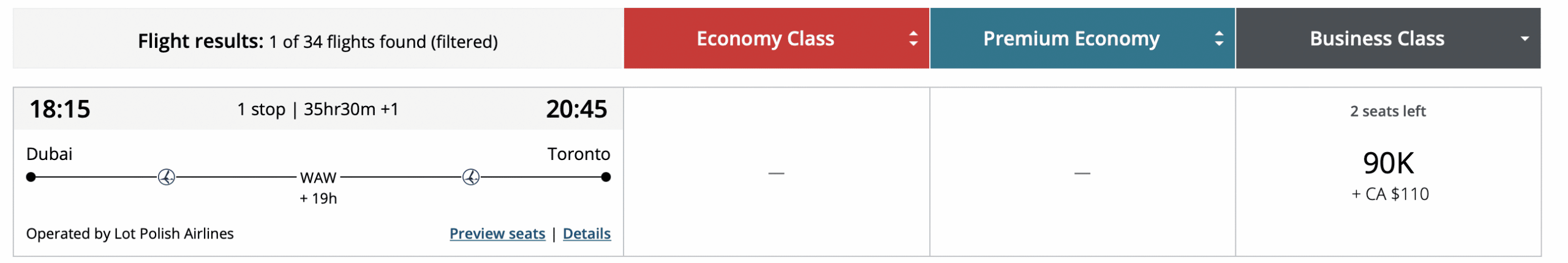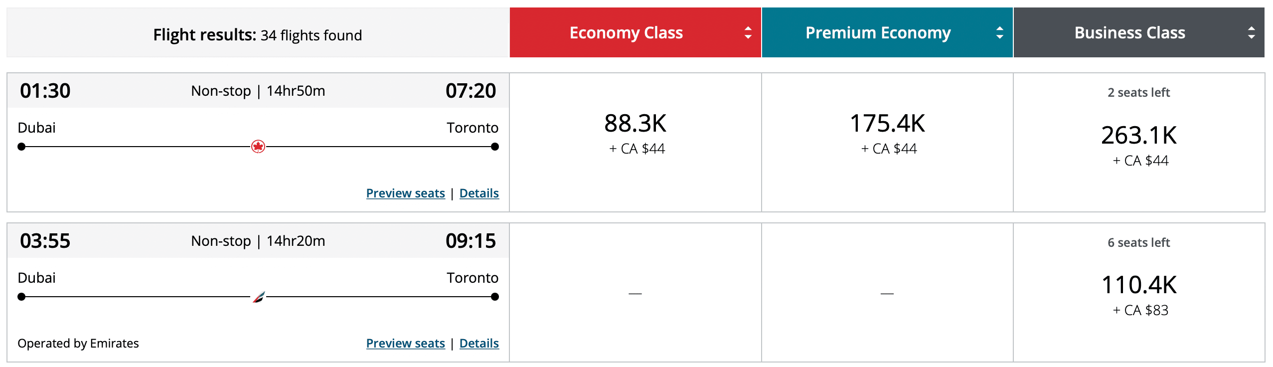 The first example we’ll look at is a popular route between Dubai and London. A direct flight with Emirates is pricing out at 34,500 Aeroplan points in economy or 72,400 points in business class.