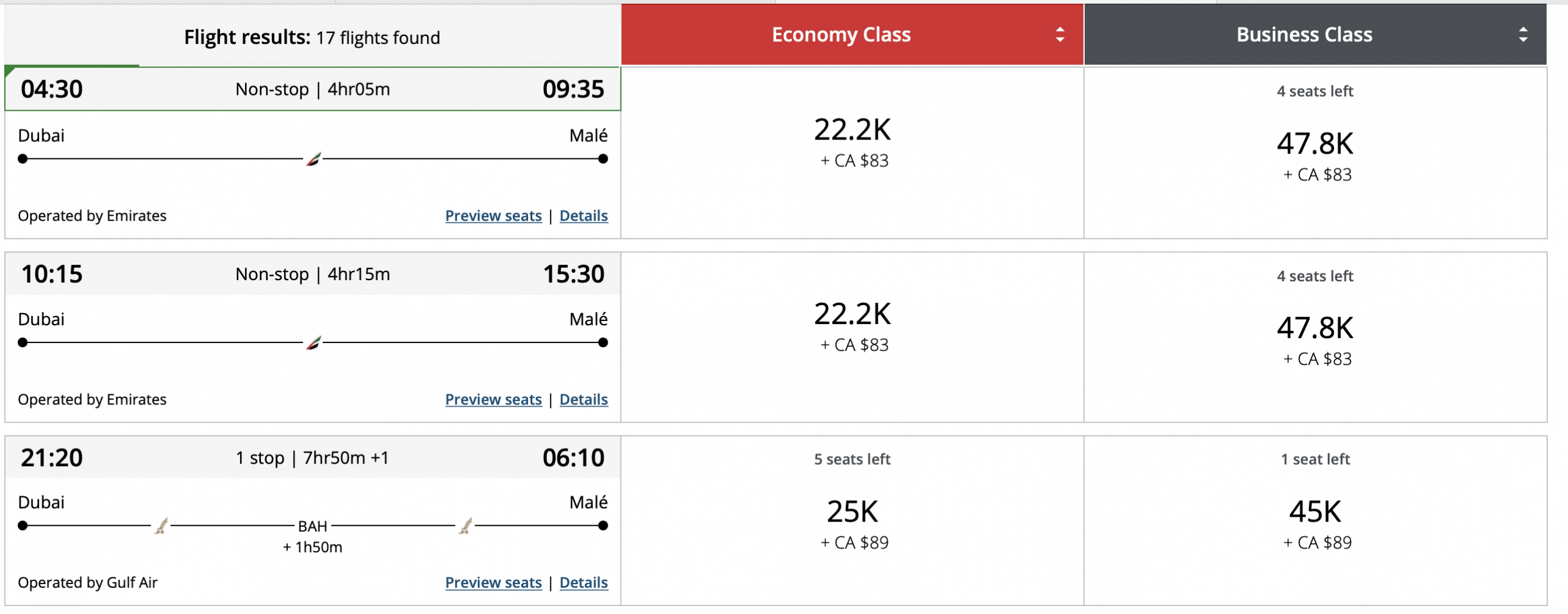 It’s interesting to note that there is a minor difference between the destinations. In economy, there’s an extra 200 points to go from Dubai to Malé, and in business class, it’s an extra 400 points.