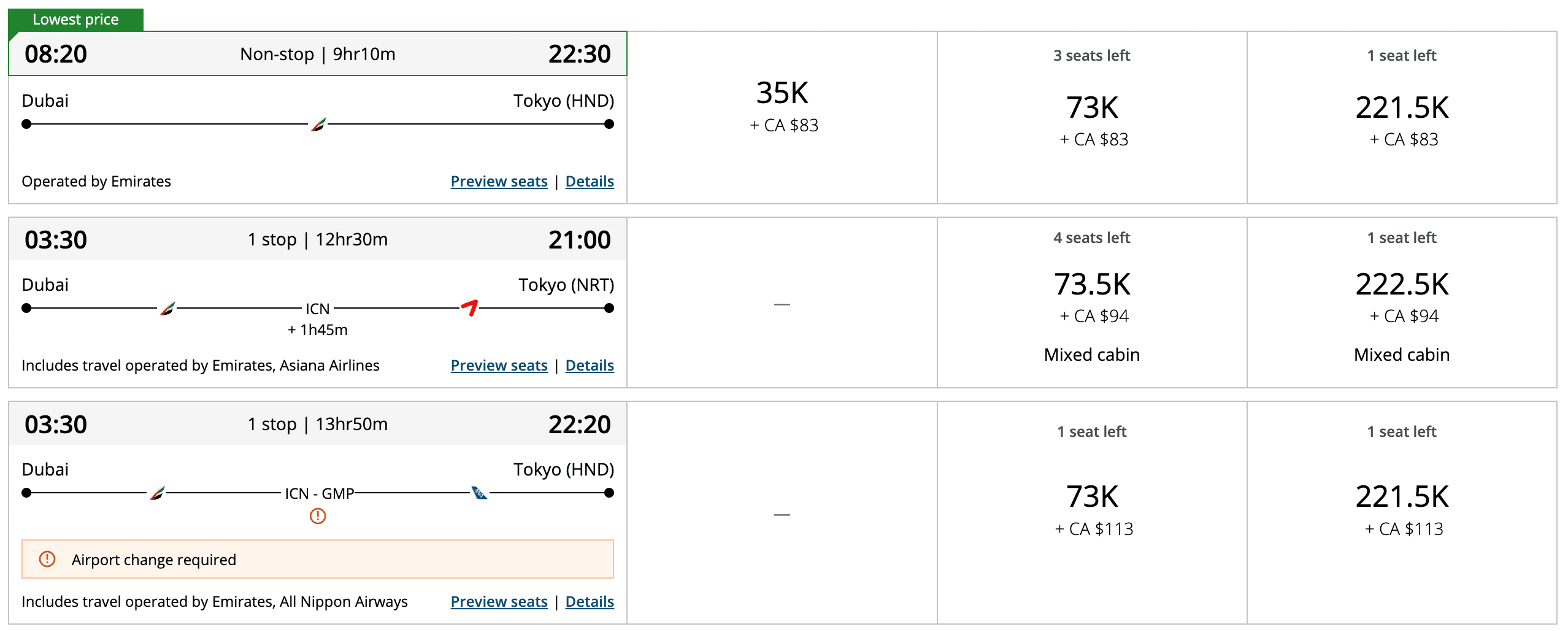 Next up, let’s take a look at a direct flight with Emirates from Dubai to Tokyo. In economy, it prices out at 46,300 points, and in business class, 83,900 points.