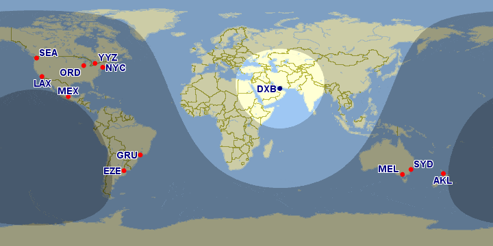 The range of 2,000 miles from Dubai covers destinations in the Middle East, Central Asia, the Indian Sub-continent, and the Horn of Africa.