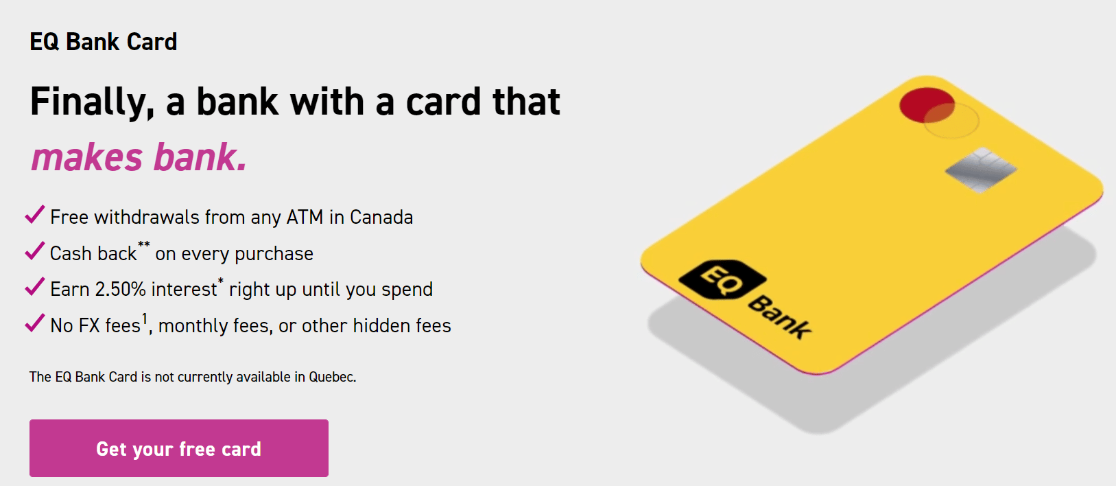 There are no fees to get or keep the card. Existing EQ Bank customers can already order the new EQ Bank Card through the mobile app.