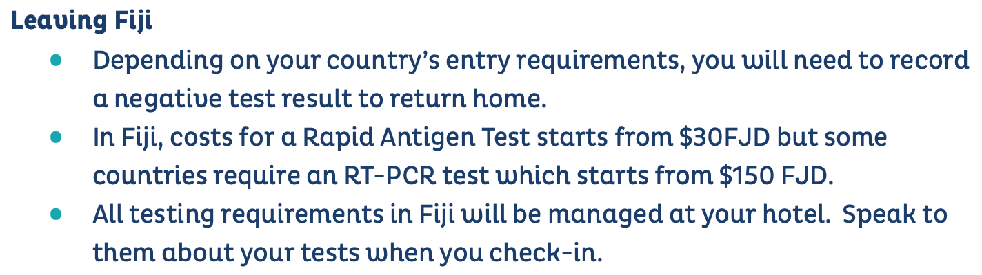 Fiji makes this extremely easy, offering RT-PCR tests from FJD$150 (~$90). All tests will be managed by hotels, so reach out to them to arrange tests 72 hours prior to departure.