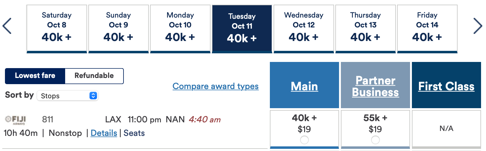Fiji tends to be a relatively difficult destination to book flights on points, akin to Bora Bora.