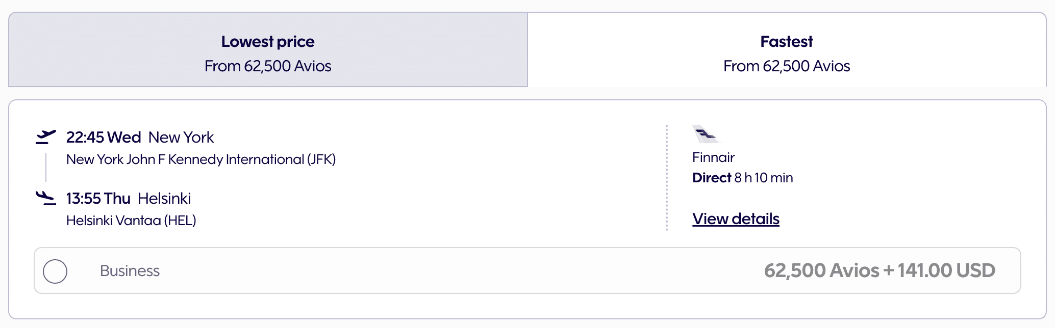 For example, a one-way flight between New York and Helsinki costs 62,500 Avios + $141 (USD) in taxes and fees if booked via Finnair Plus.
