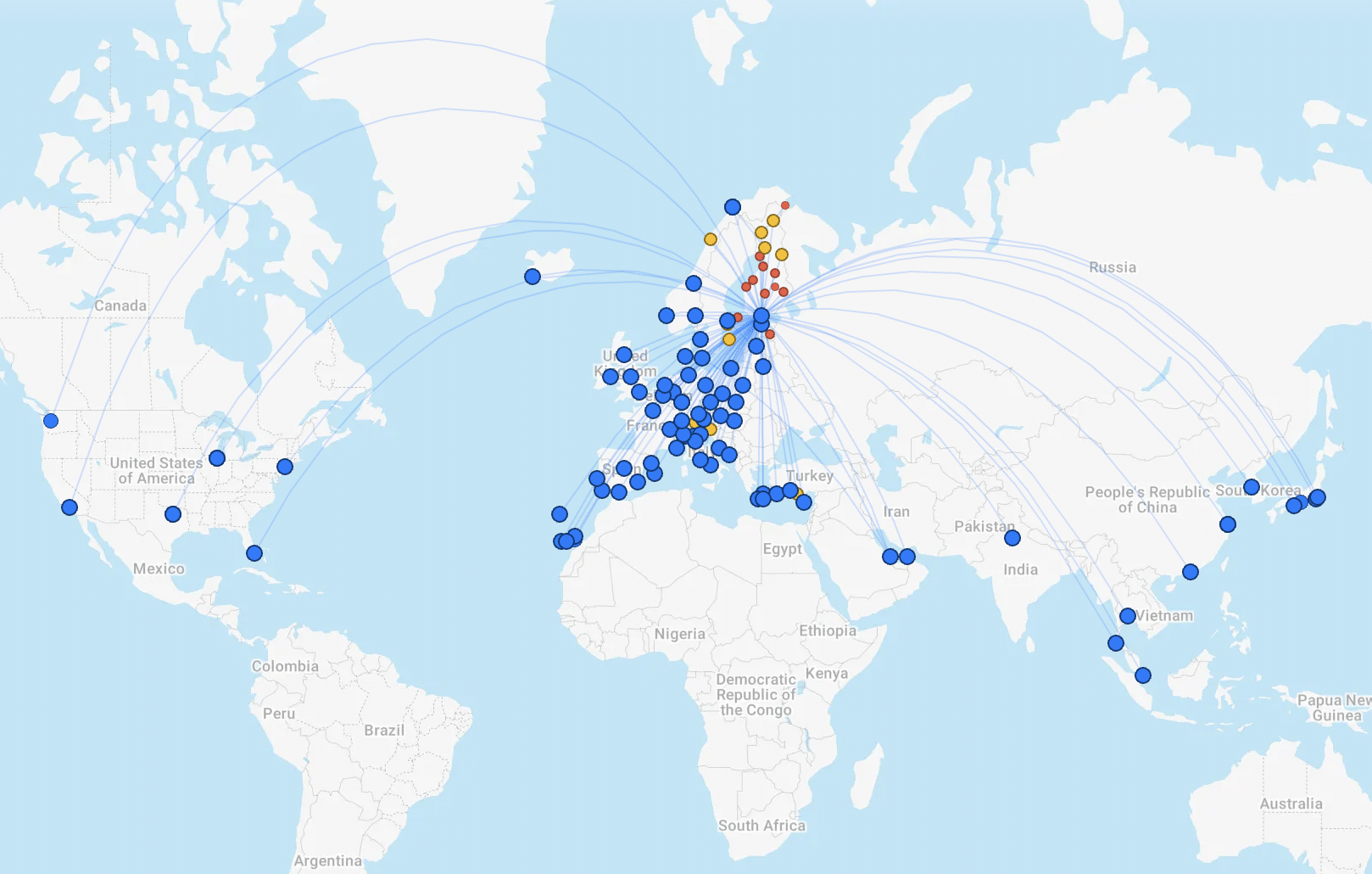 Finnair flies between Helsinki-Vantaa Airport (HEL) and five destinations in the US: Seattle (SEA), Los Angeles (LAX), Chicago (ORD), Dallas (DFW), Miami (MIA), and New York (JFK). In total, the airline flies to 80 destinations in Europe, Asia, and North America.