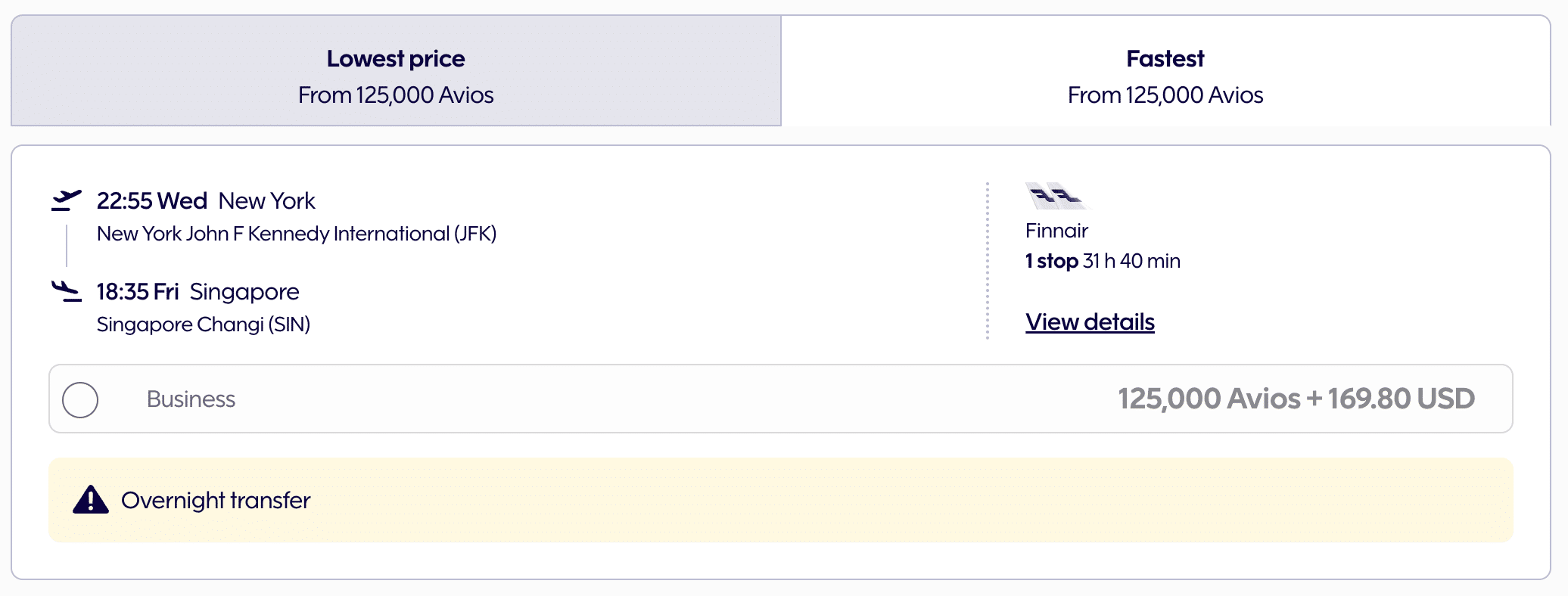 With Finnair Plus, the cost of connecting flights is added cumulatively, except for within Finland and Northern Europe. This means a one-way New York–Helsinki–Singapore ticket in business class costs 125,000 Avios + $170 (USD) in taxes and fees.