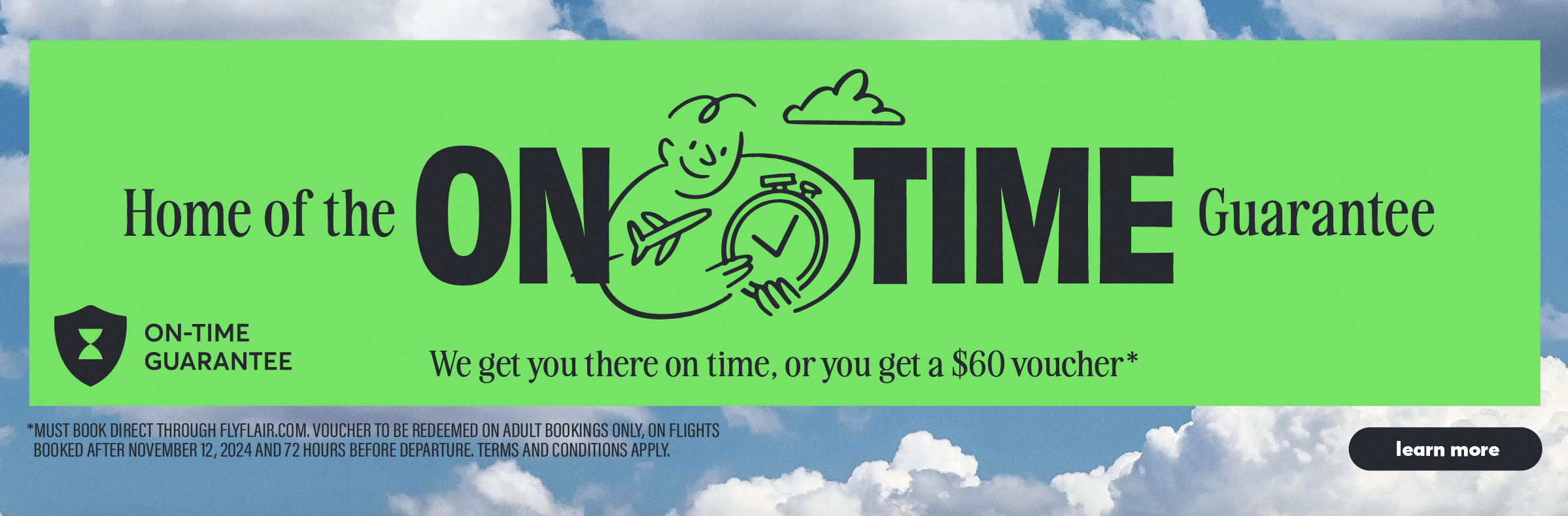 How the on-time guarantee works is fairly straightforward. Flair will give you a $60 e-voucher if any of the following happens: