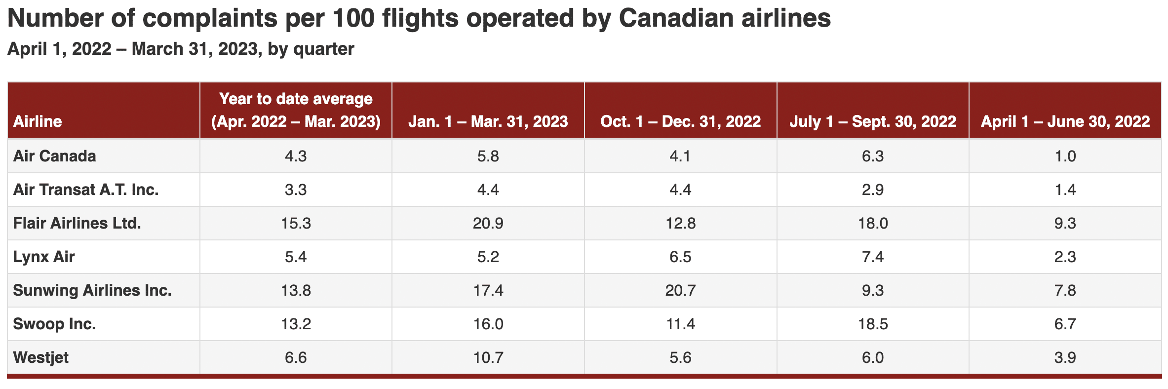 In the same time period, Flair’s average number of complaints per 100 flights was well above Lynx Air, which had just 5.2 complaints per 100 flights, and slightly above Swoop, which had 16 complaints per 100 flights.