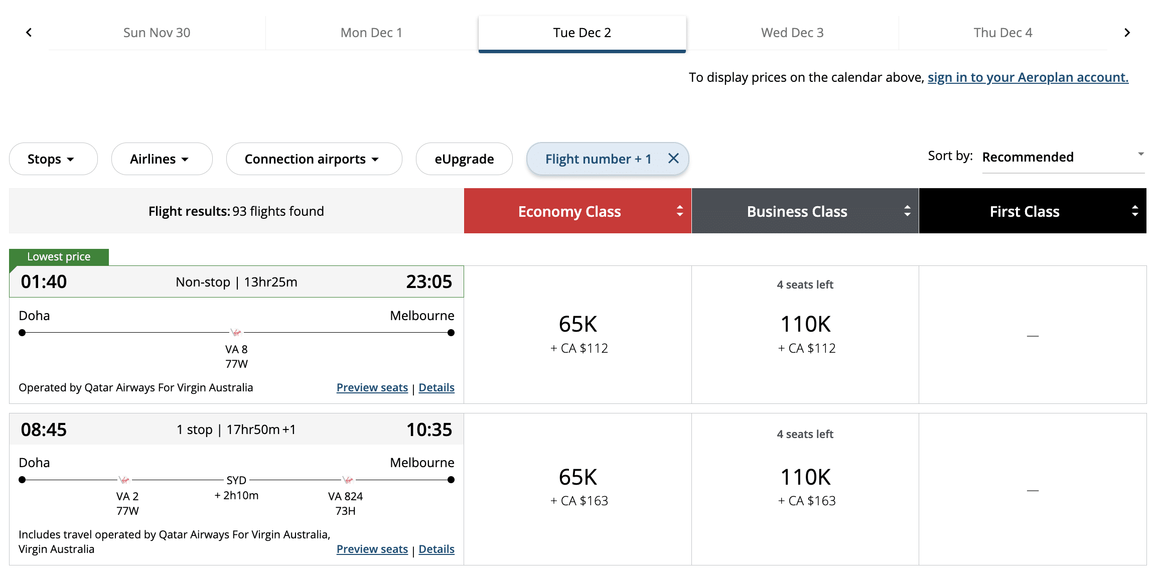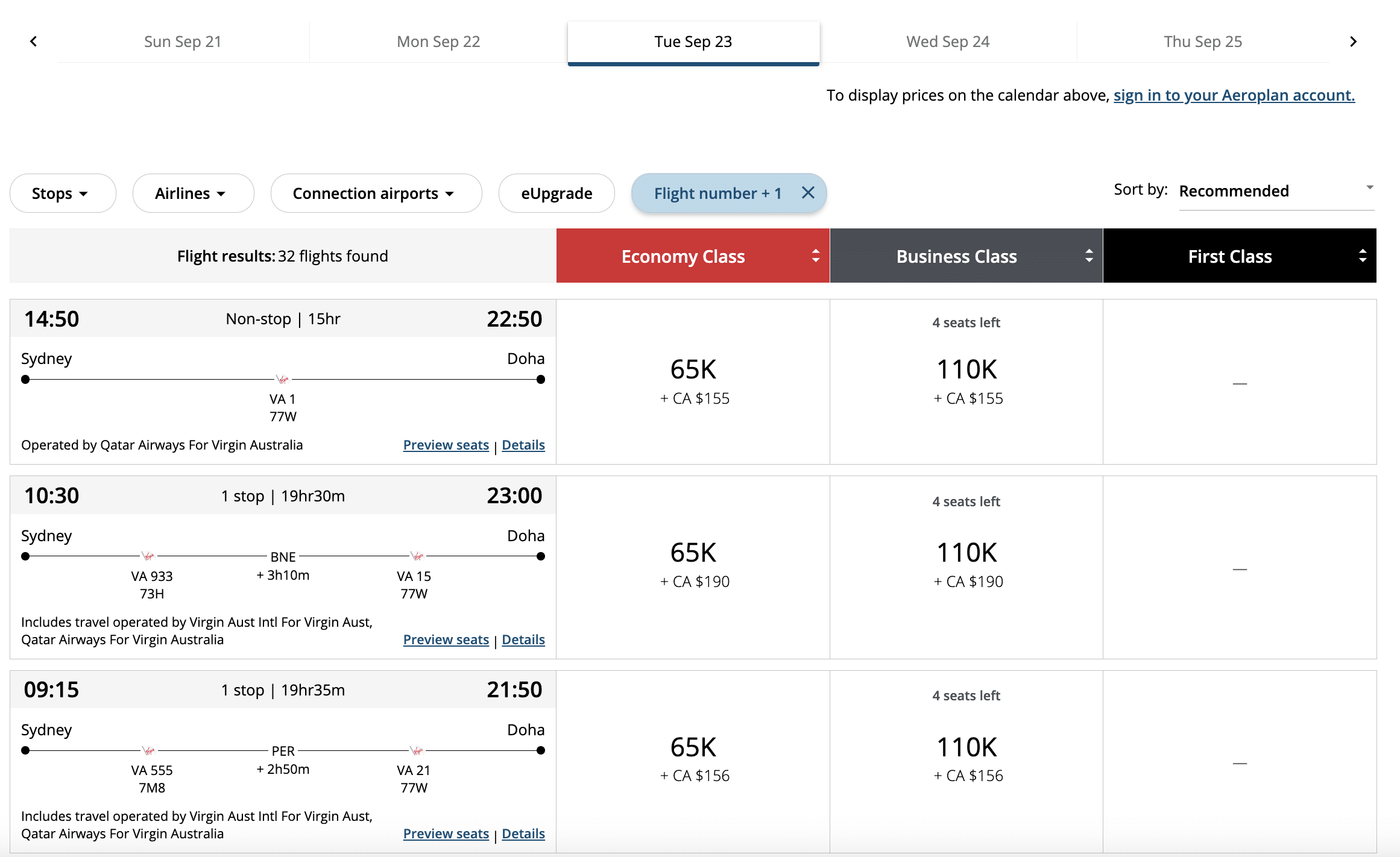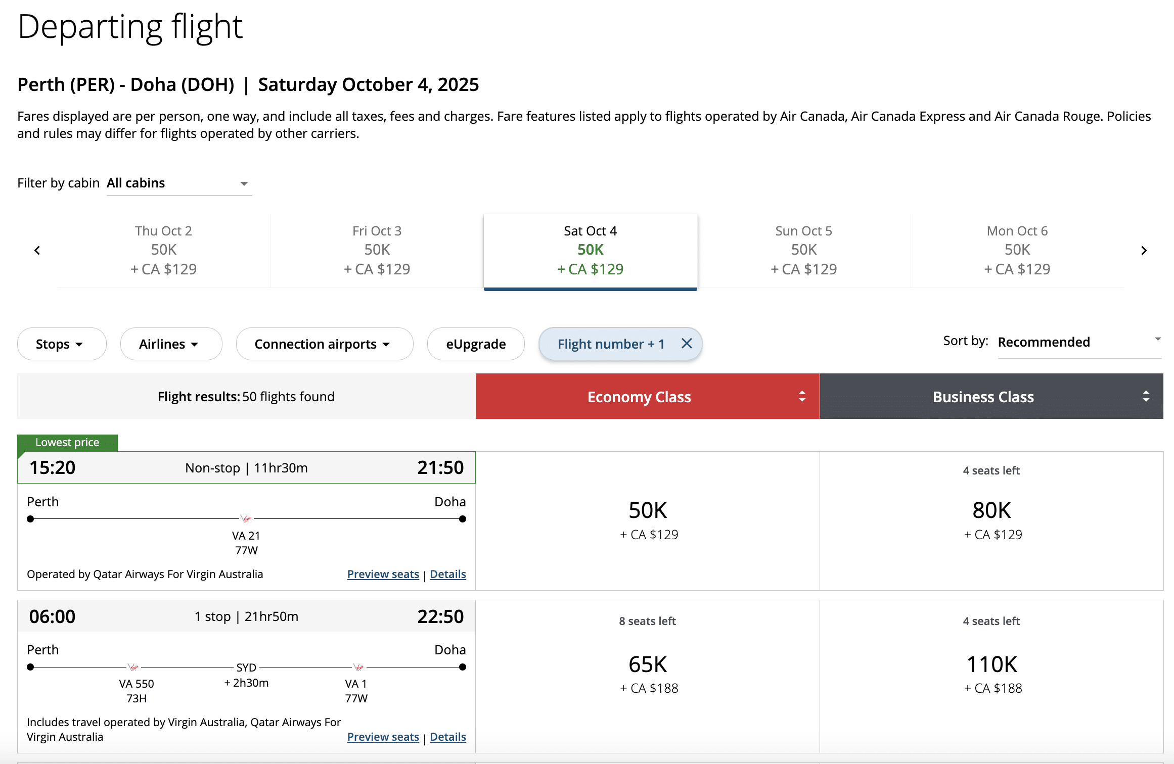 - Economy class: From Perth to Doha: 50,000 Aeroplan points, from Brisbane and Sydney to Doha: 65,000 Aeroplan points