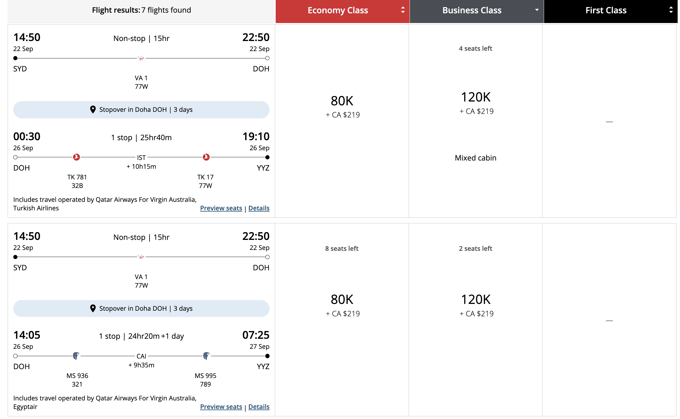Virgin Australia’s upcoming long-haul flights to Doha are officially bookable using Aeroplan points.