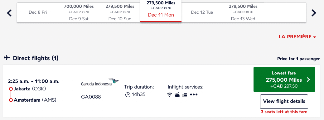 A one-way ticket on this route prices out at 275,000 Flying Blue miles, plus $297 (CAD) in taxes and fees.