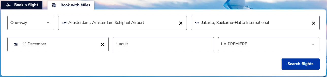 First Class redemptions with Garuda Indonesia are only possible through the Air France website at the moment, and not the KLM version of Flying Blue. When searching, you’ll have to select “La Première” as the desired cabin if you’re searching for First Class awards.
