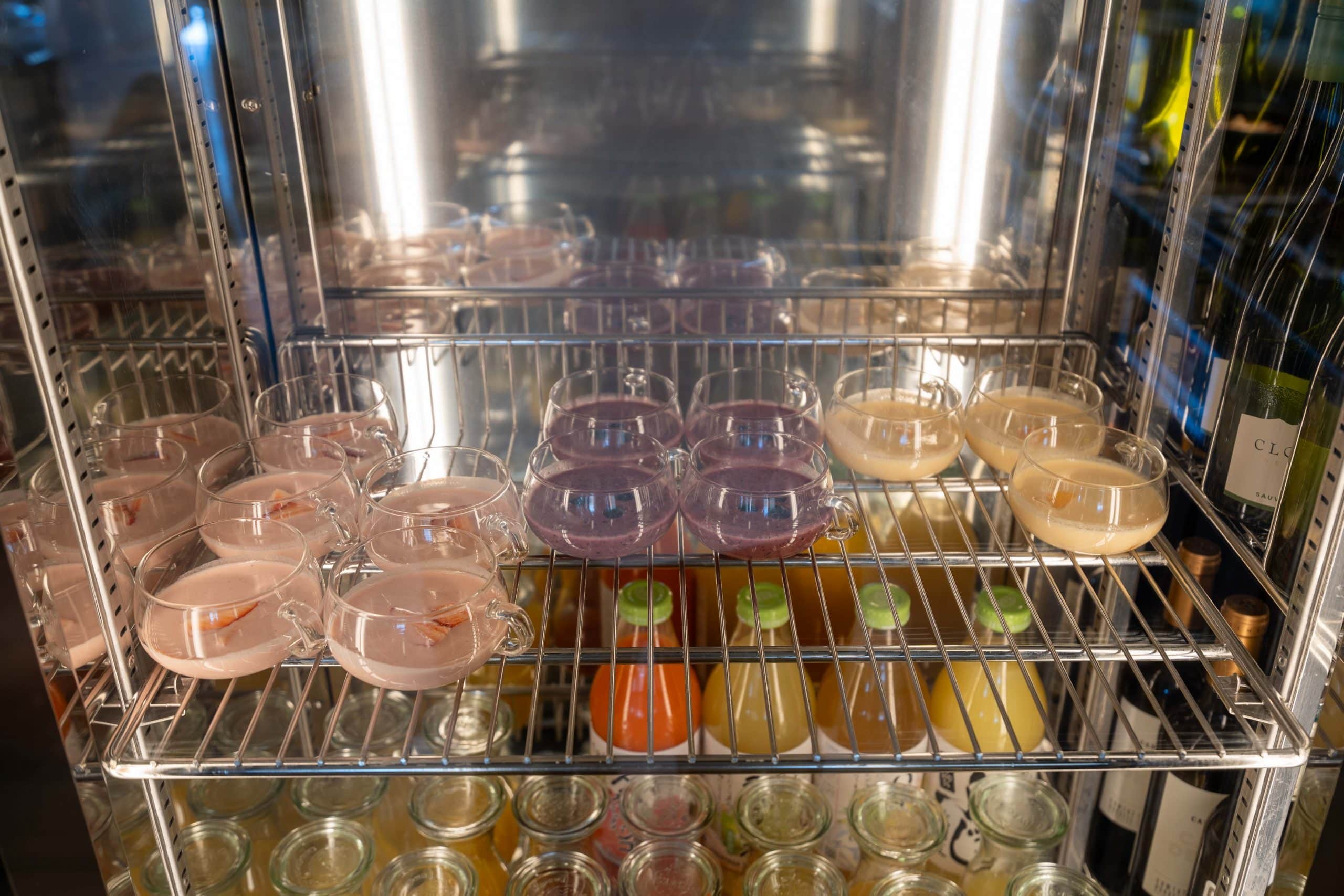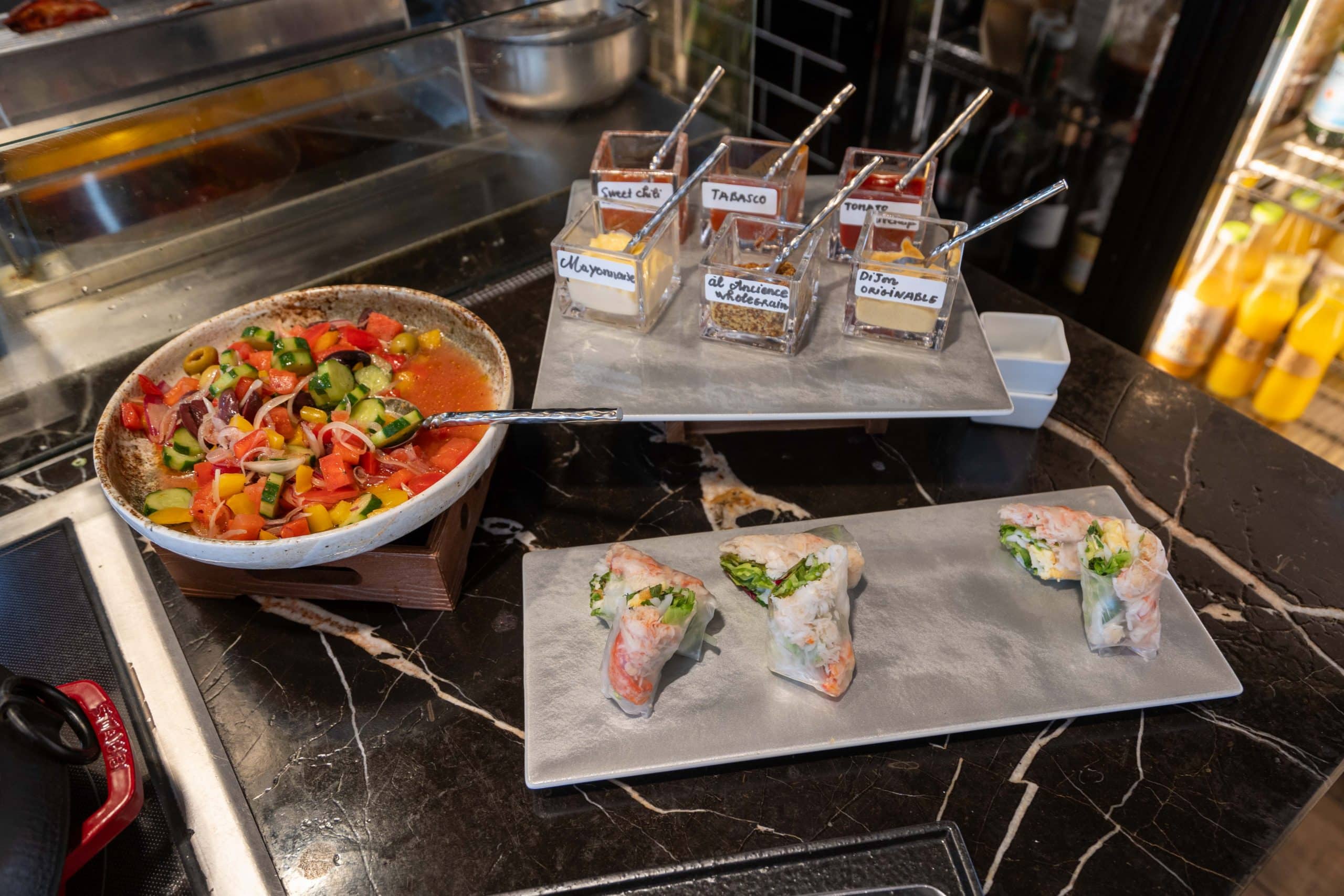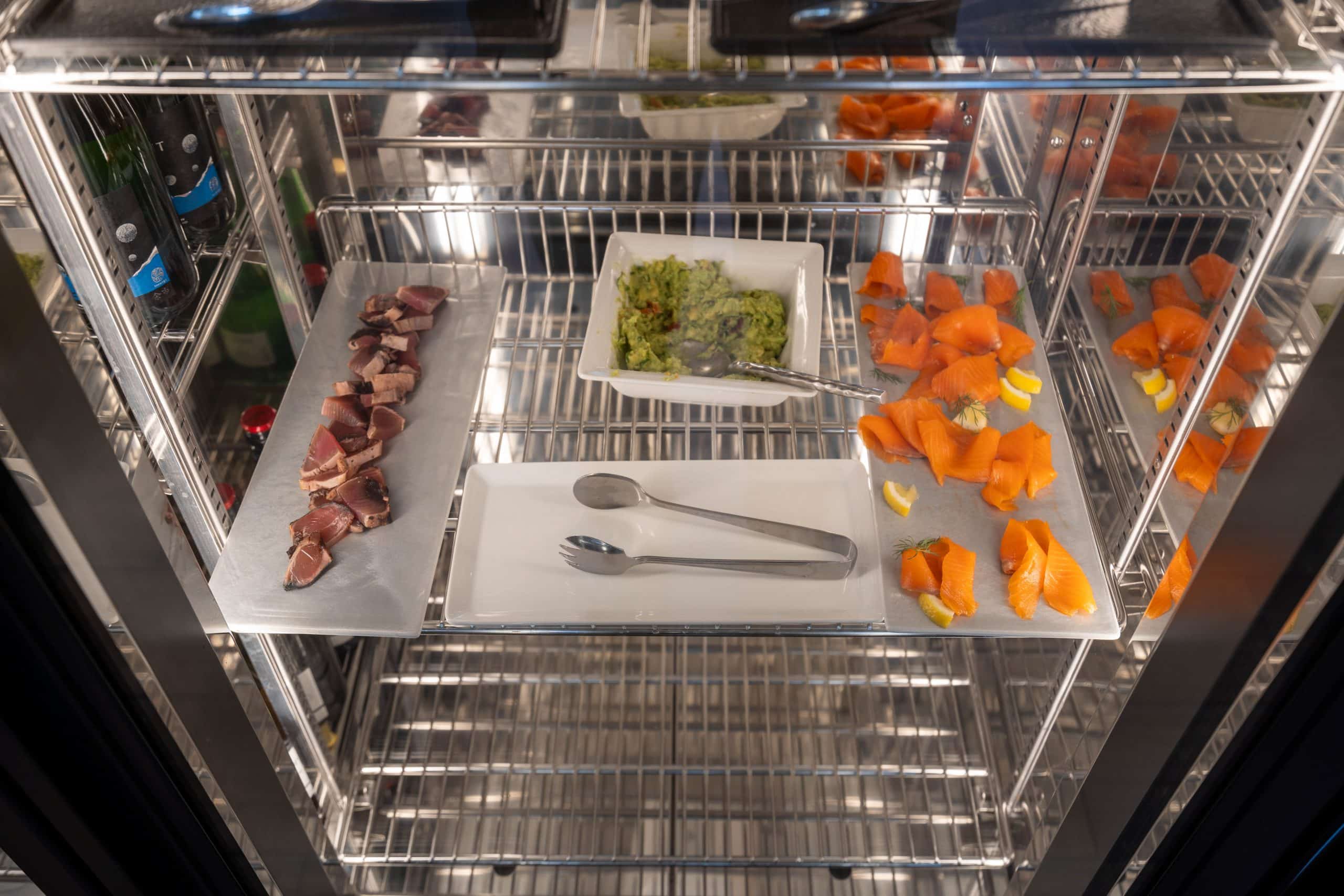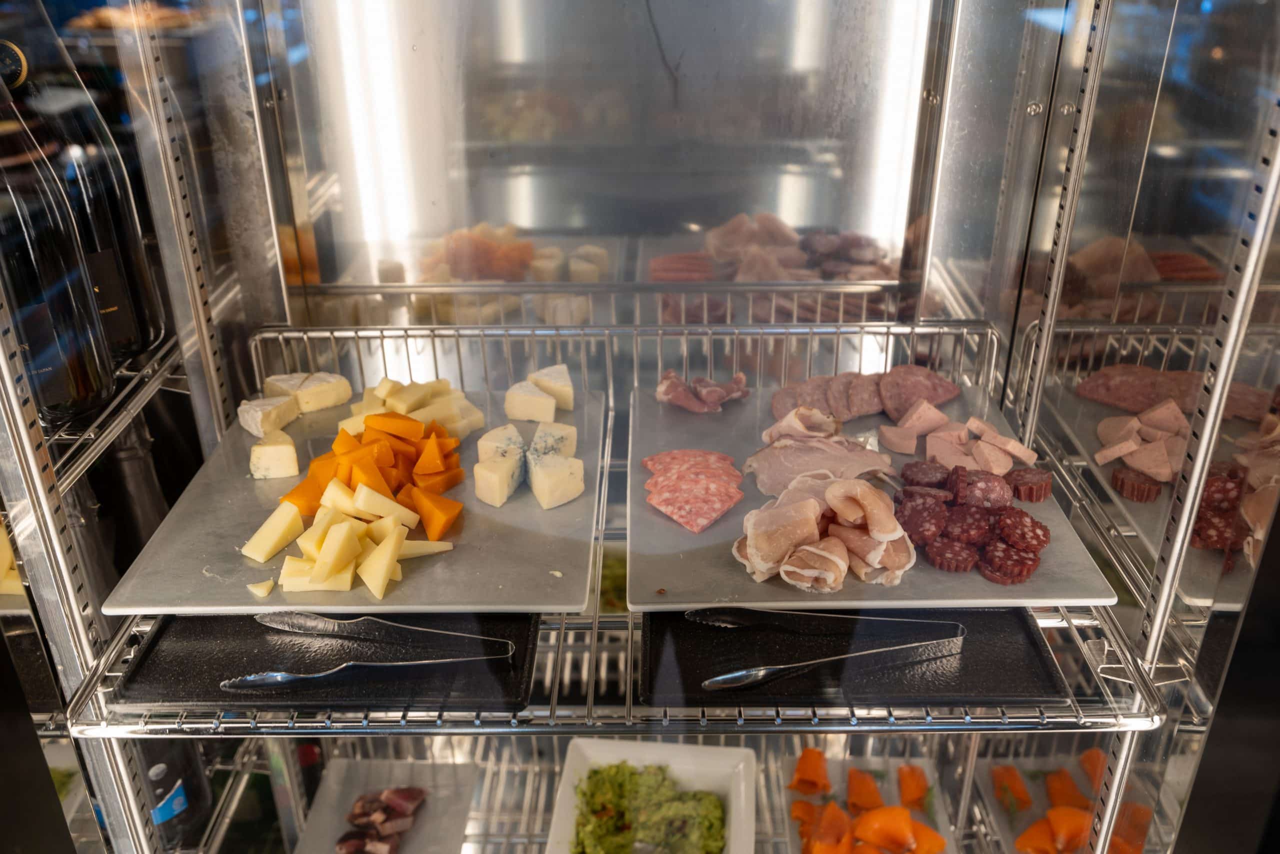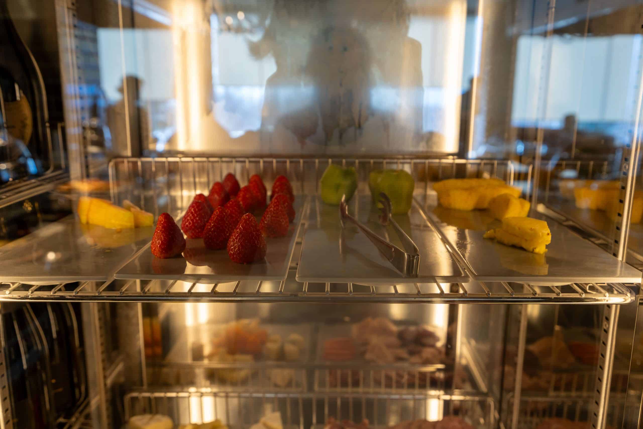 The cold buffet section boasts a variety of fresh salads, fruits, cured meats, cheeses, and yogurt. Other refreshments include carafes of juice, conveniently placed in a refrigerator for guests.