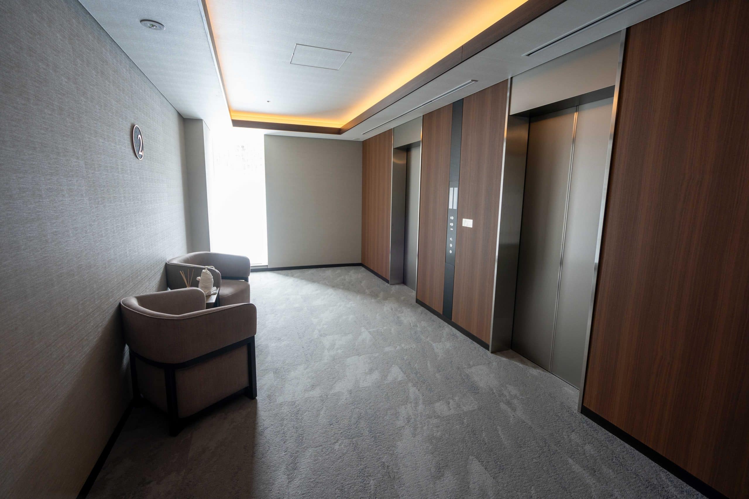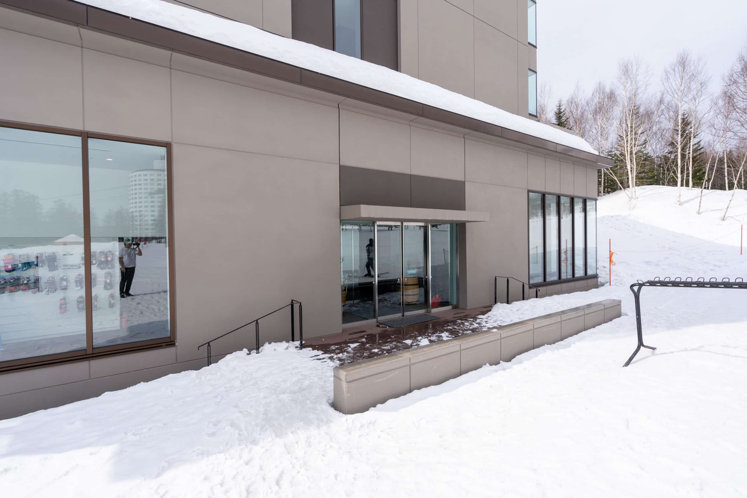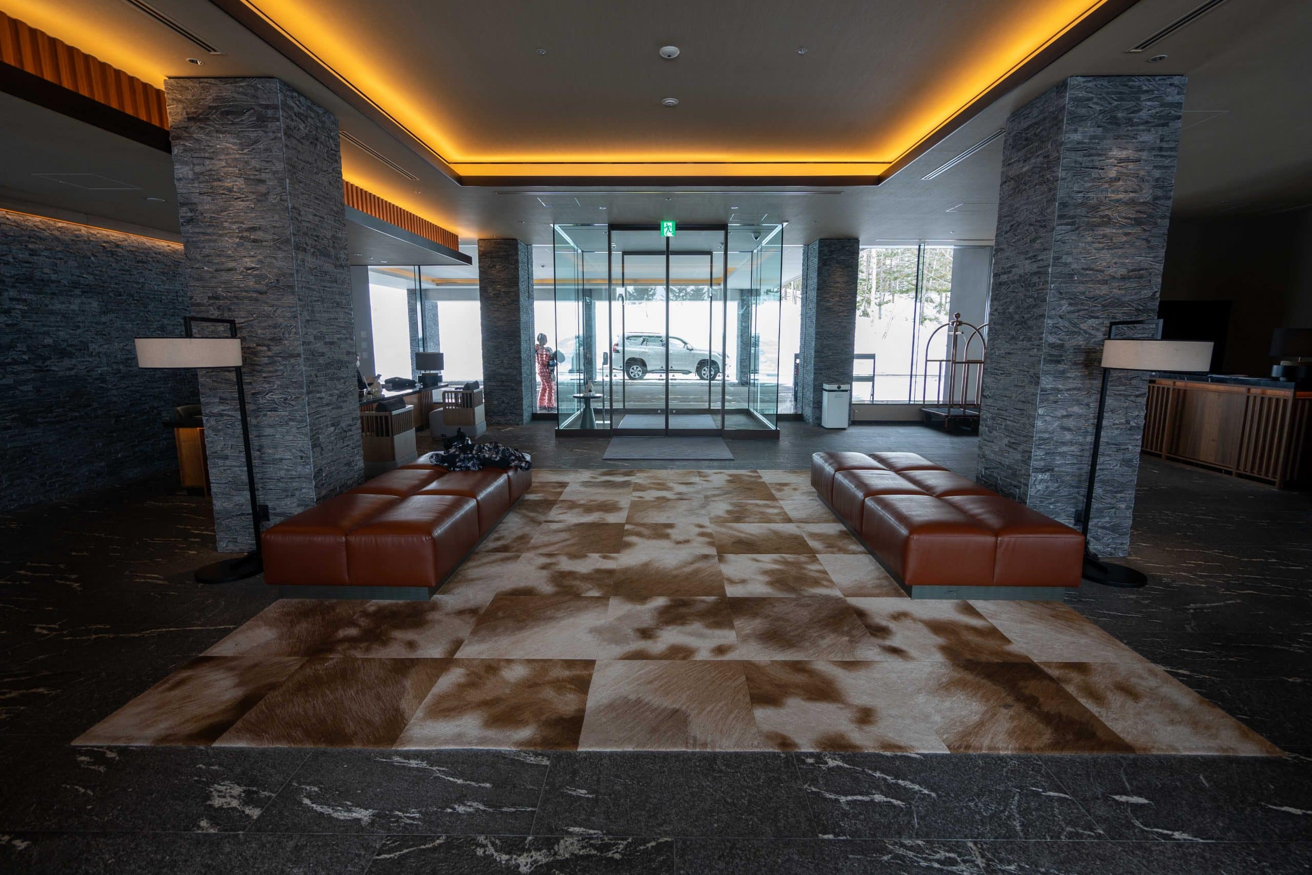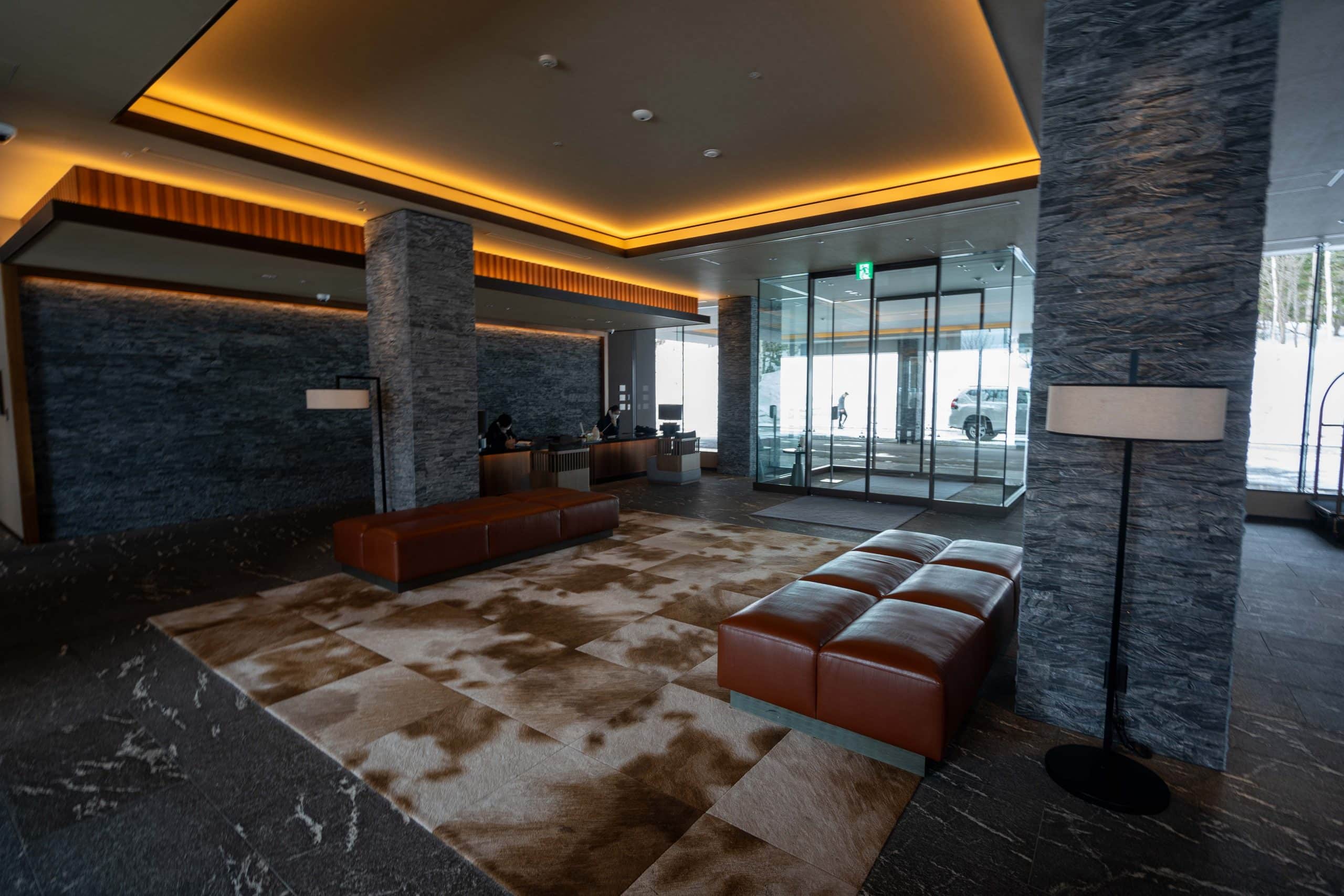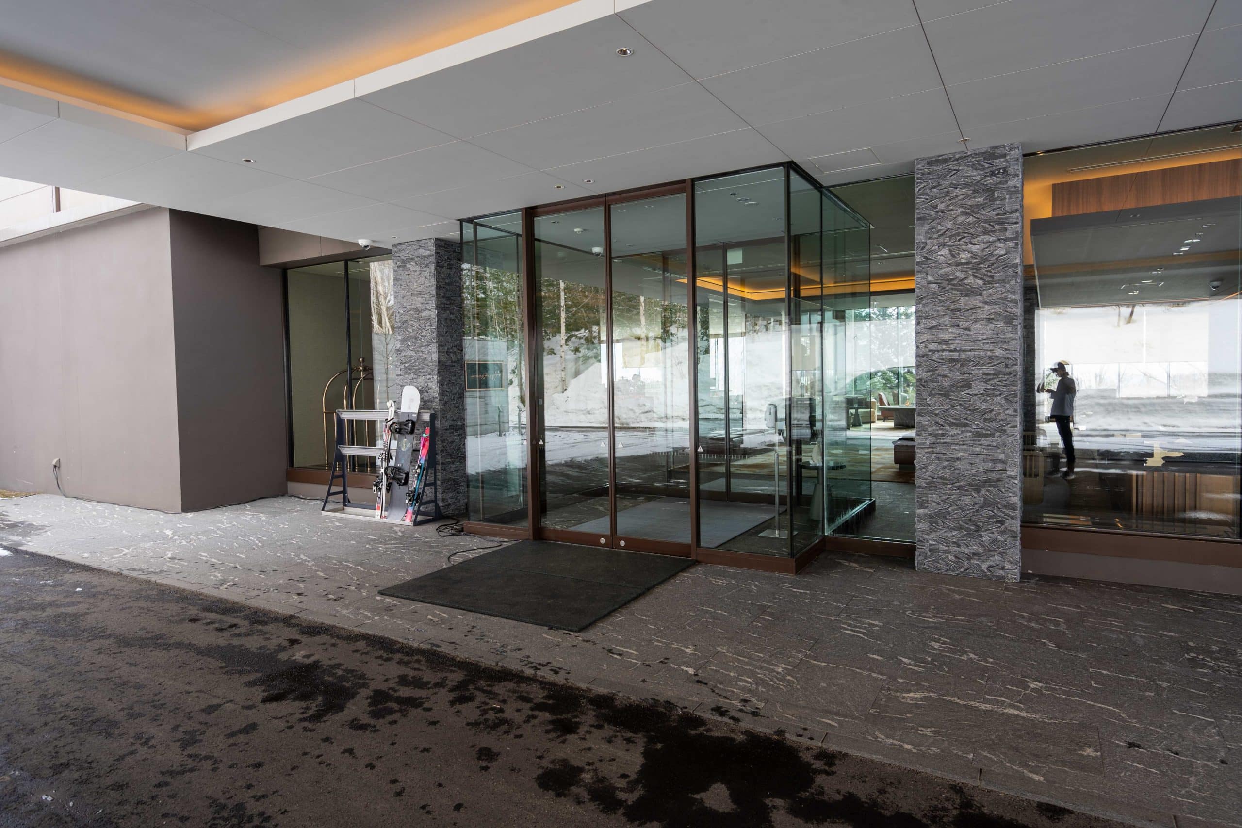 As I arrived at Higashiyama Niseko Village, I was greeted by a main entrance framed by a simplistic porte-cochère, underlined by strong stone pillars. A secondary pedestrian entrance can be found on the right-hand side of the building.