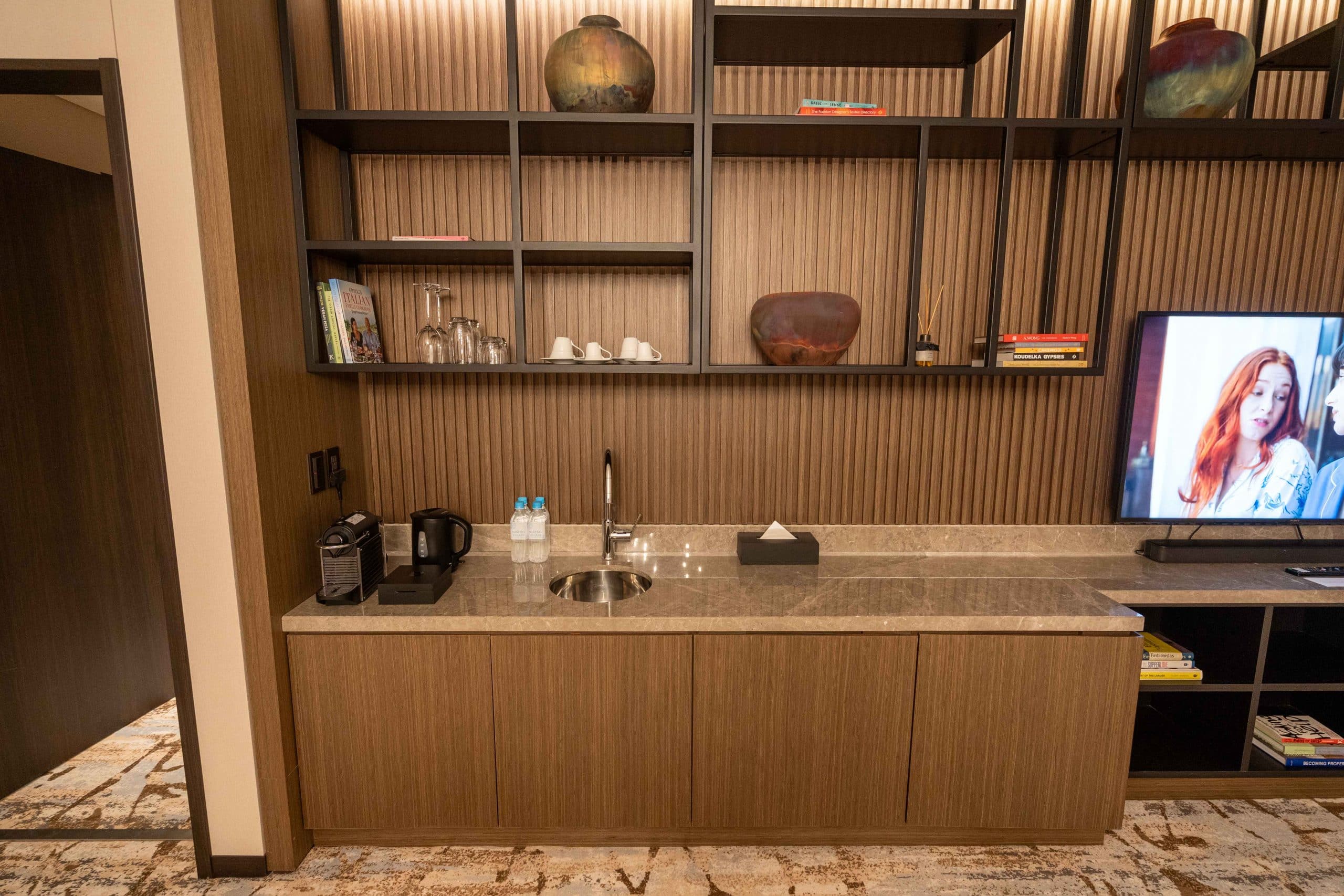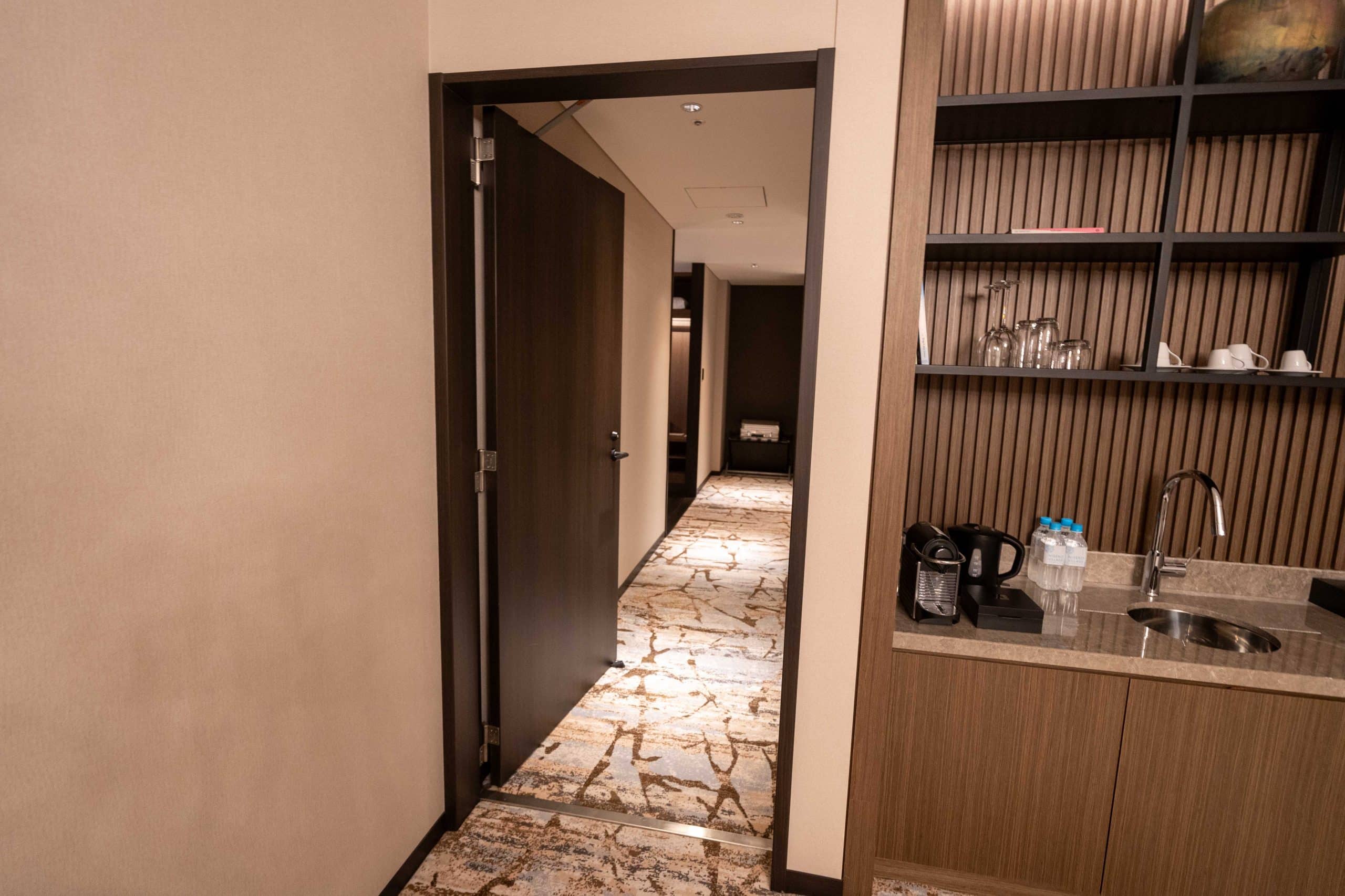 Adjacent is a kitchenette, fitted with minibar, Nespresso coffee maker, kettle, and water bottle. The mini-fridge came stocked with soft drinks and sparkling water.