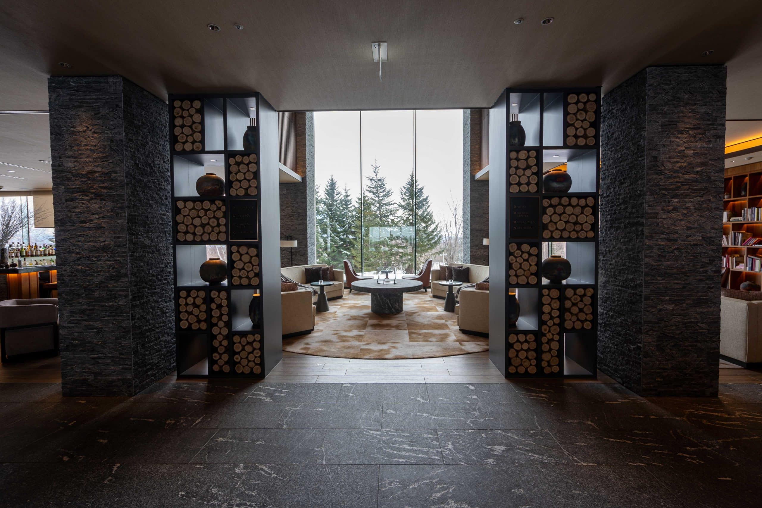 The entryway leads to the first-floor lobby, which elegantly connects to the hotel’s dining spaces and lounge, all of which benefit from floor-to-ceiling windows offering stunning views of Mount Yotei.