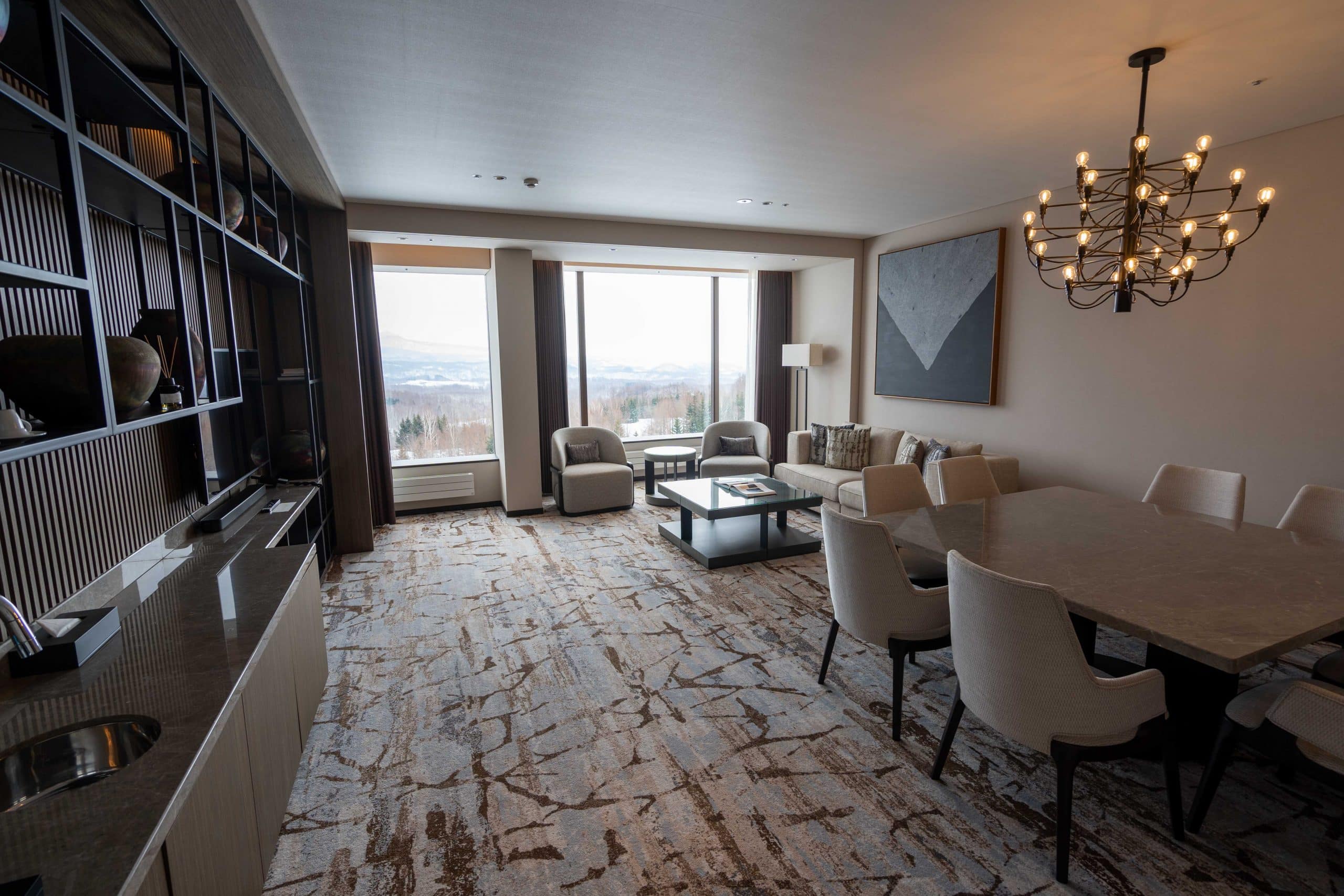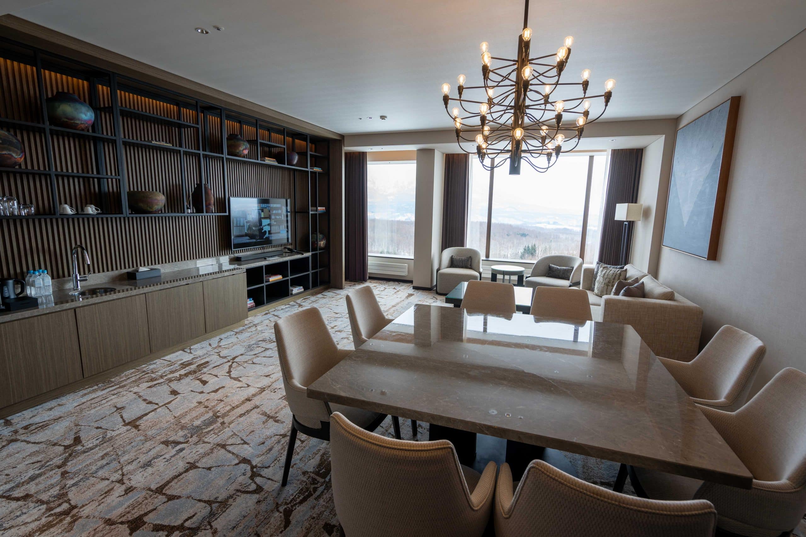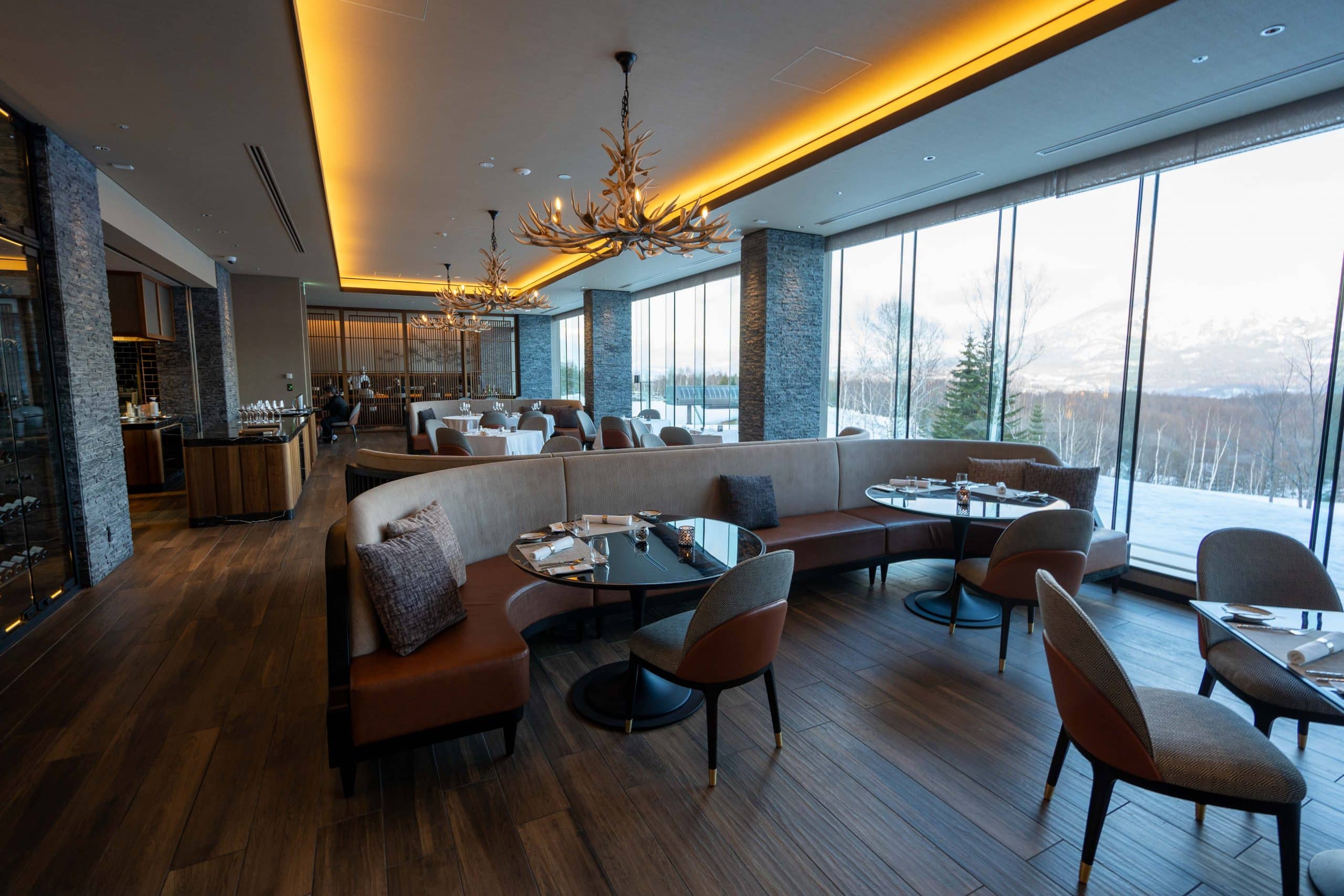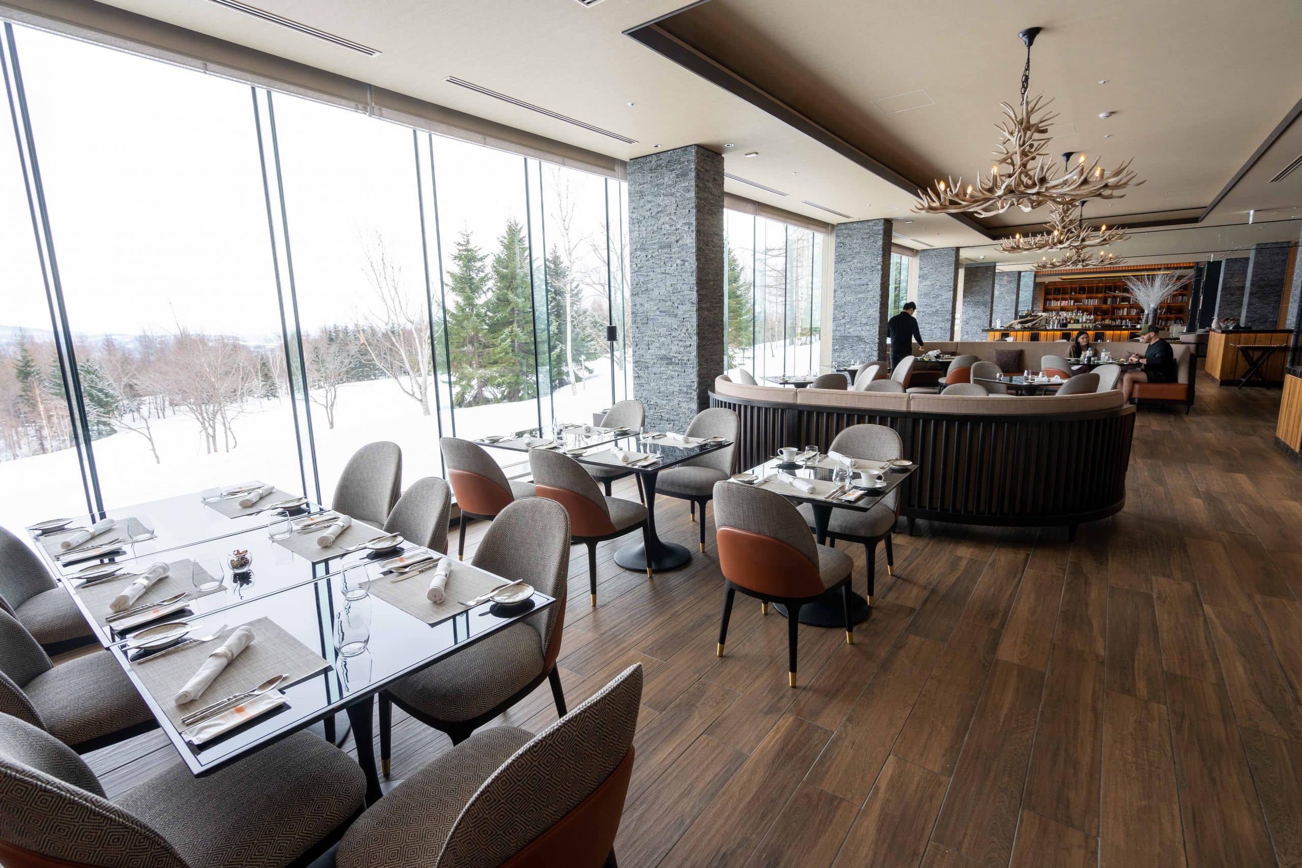 The dining area marries modern alpine luxury with a sweeping panorama of Hokkaido’s natural beauty, and plenty of seating.