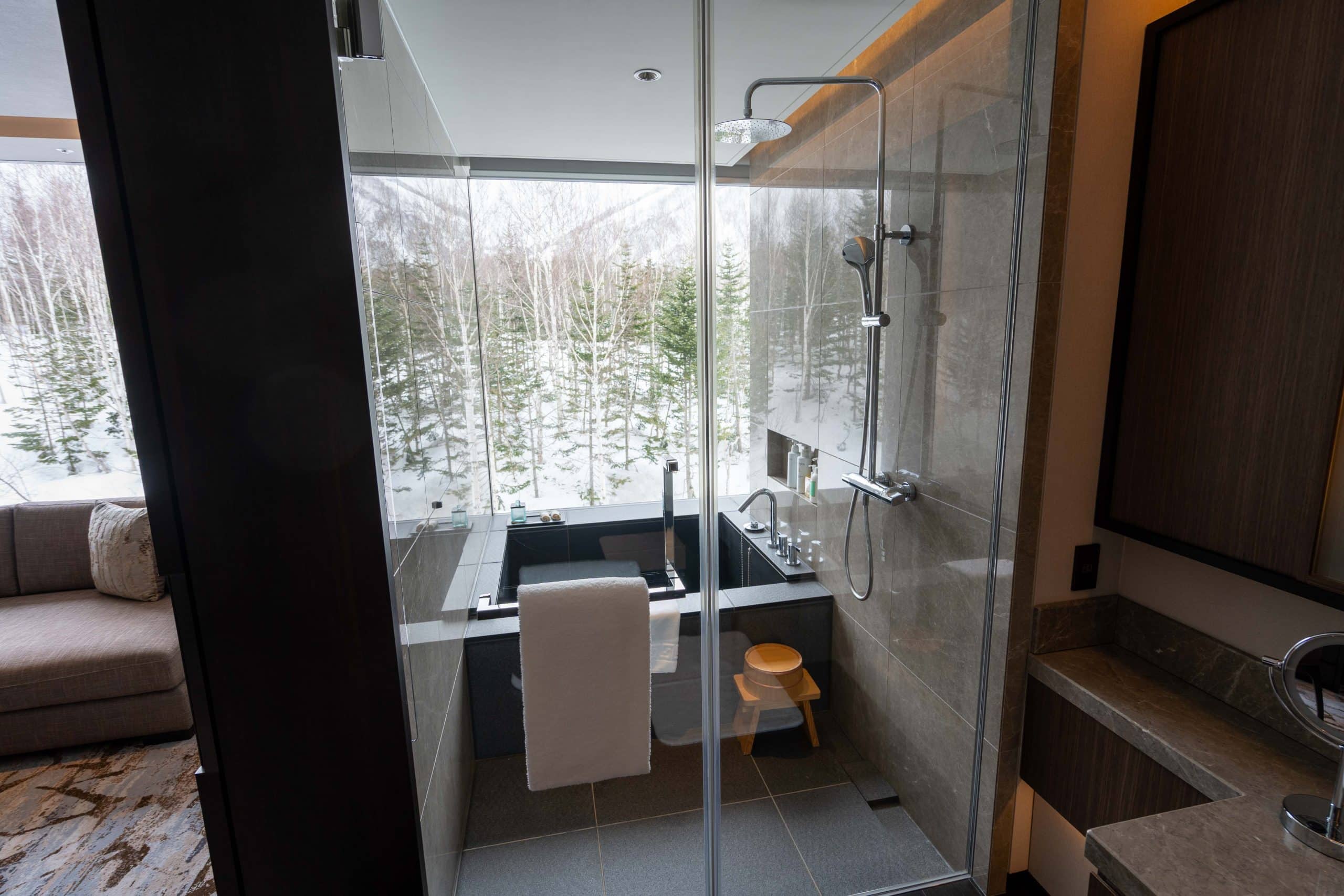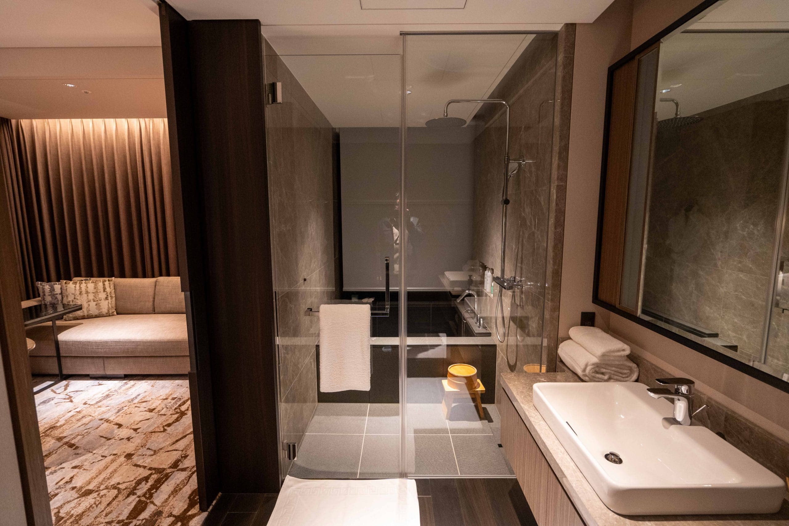 To the left, you’ll find a luxurious walk-in rain shower surrounding a deep bathtub, reminiscent of an onsen in design, but without the authentic hot spring water.