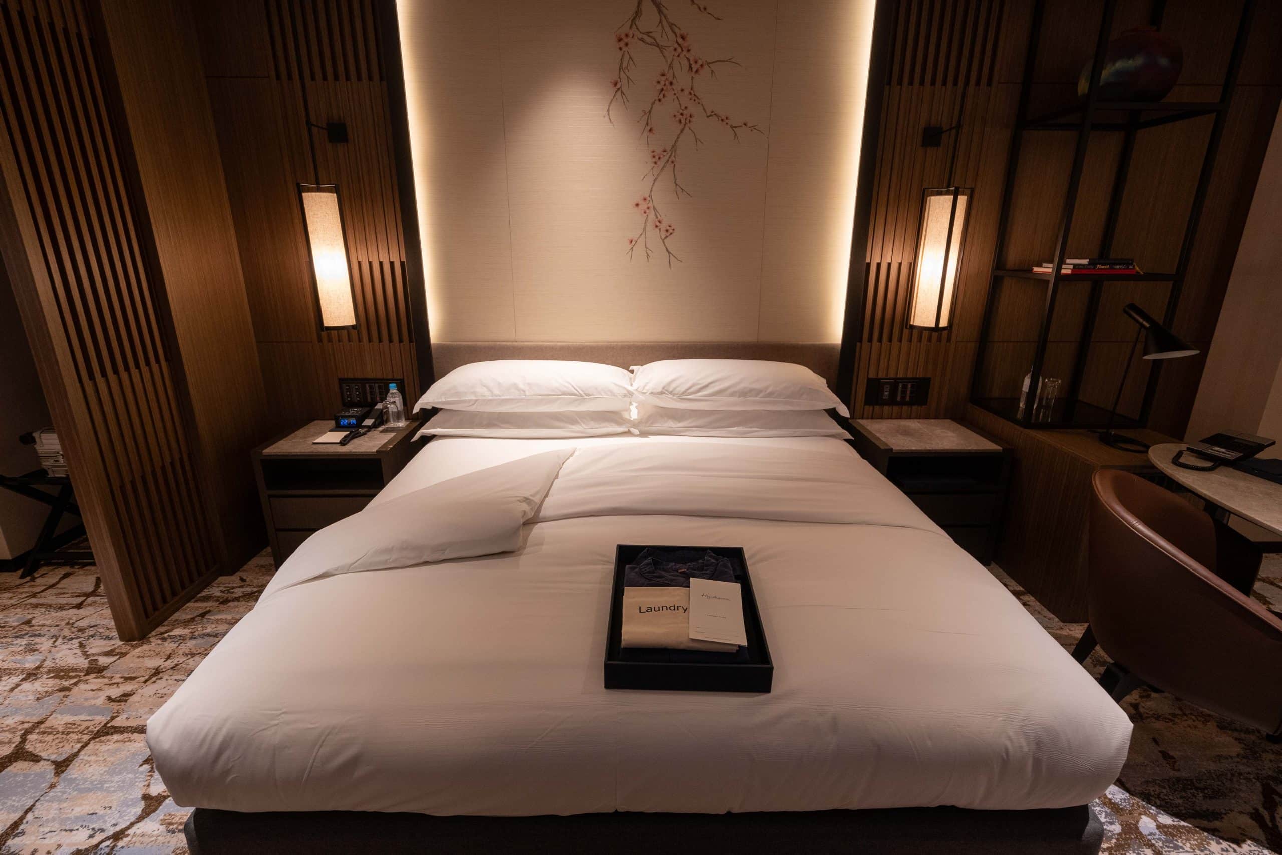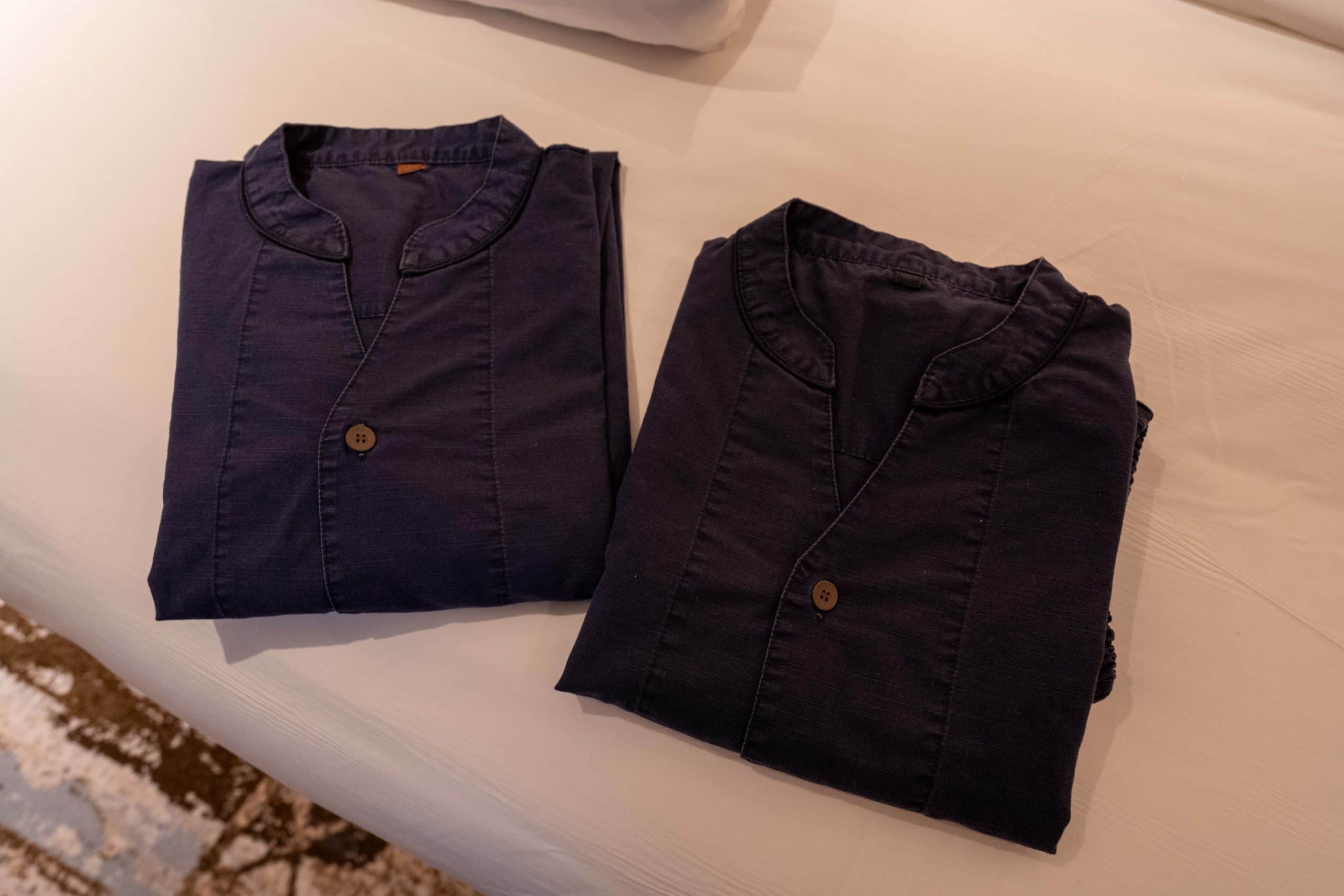 A neatly arranged set of pajamas were proactively placed on the king bed. These classic Japanese-style pajamas are perfect for lounging in the room or when making a visit to the onsen downstairs.