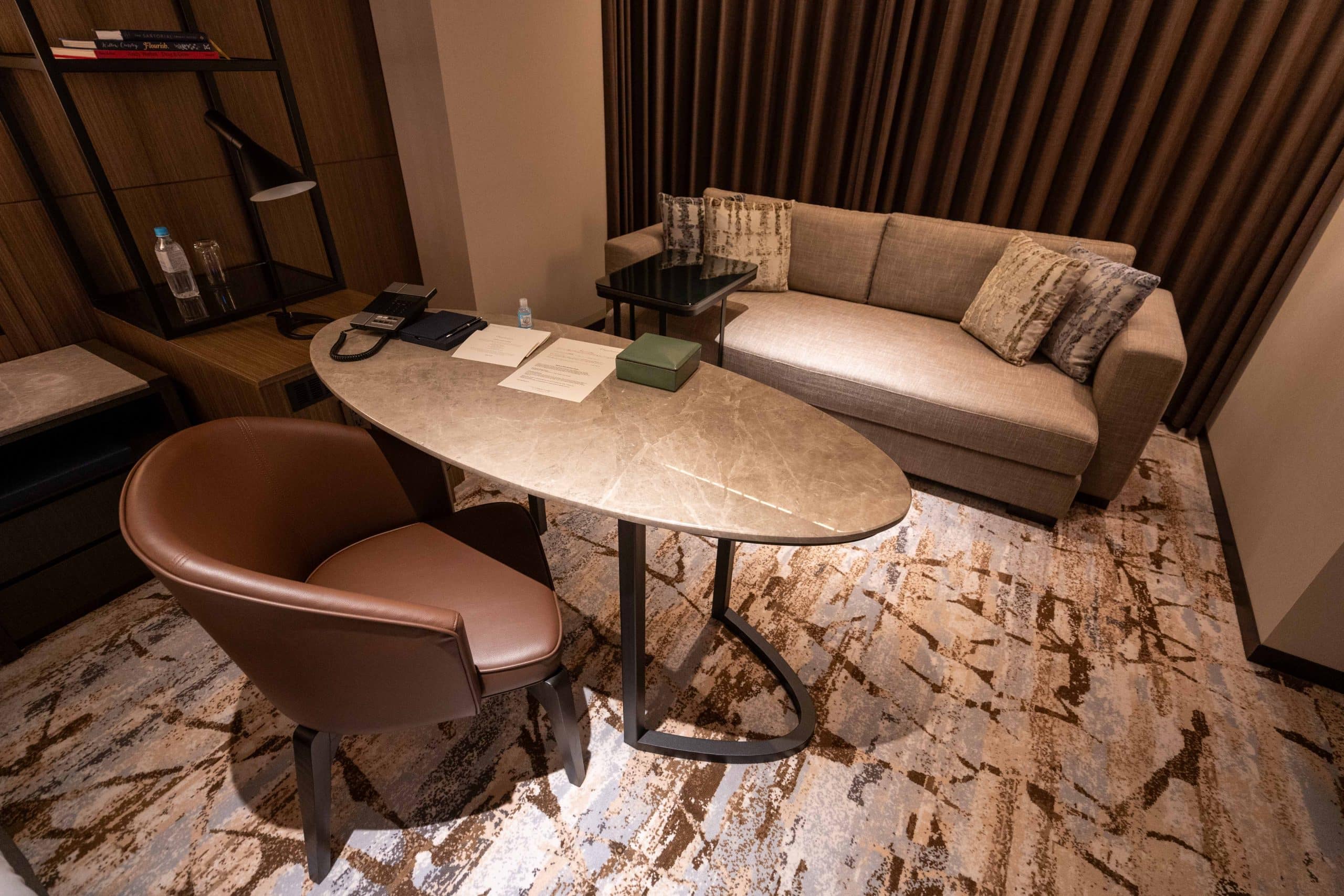 The room features a luxurious desk to its right, crowned with an elegant oval-shaped marble top, which was a pleasure to work from.