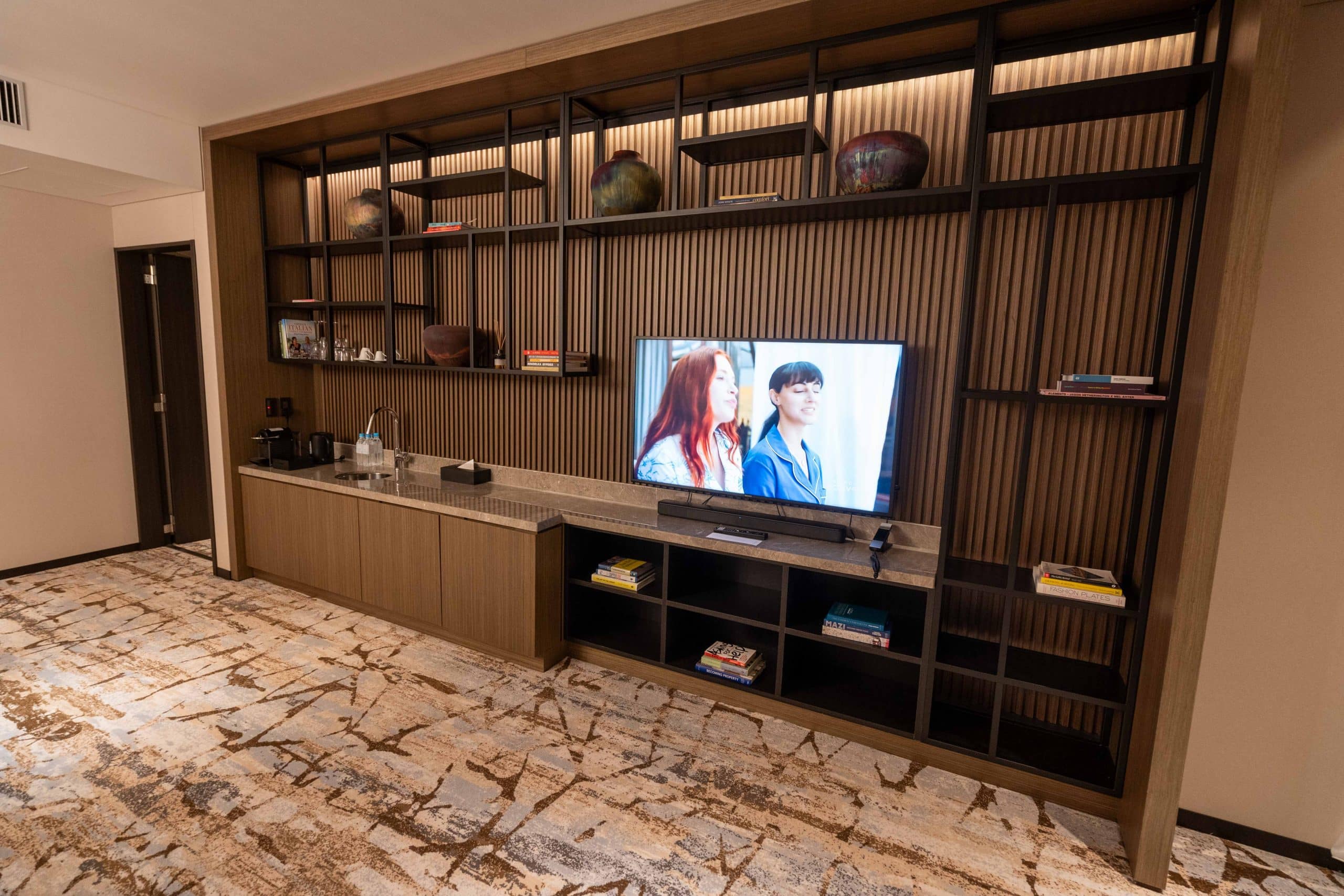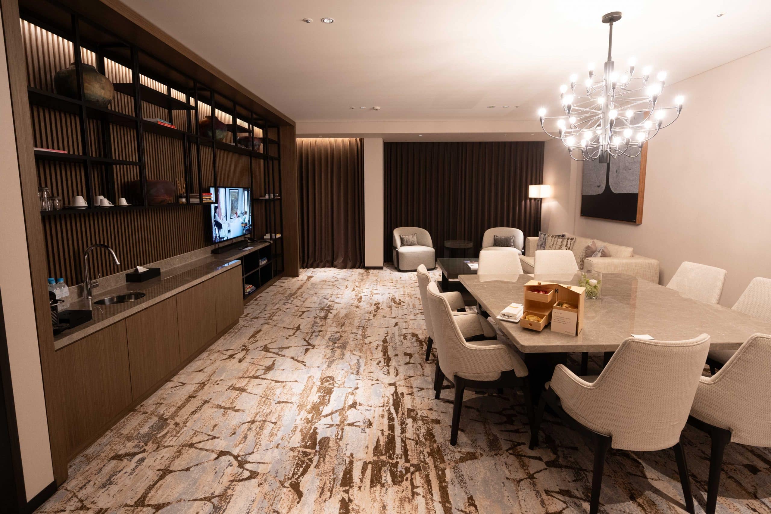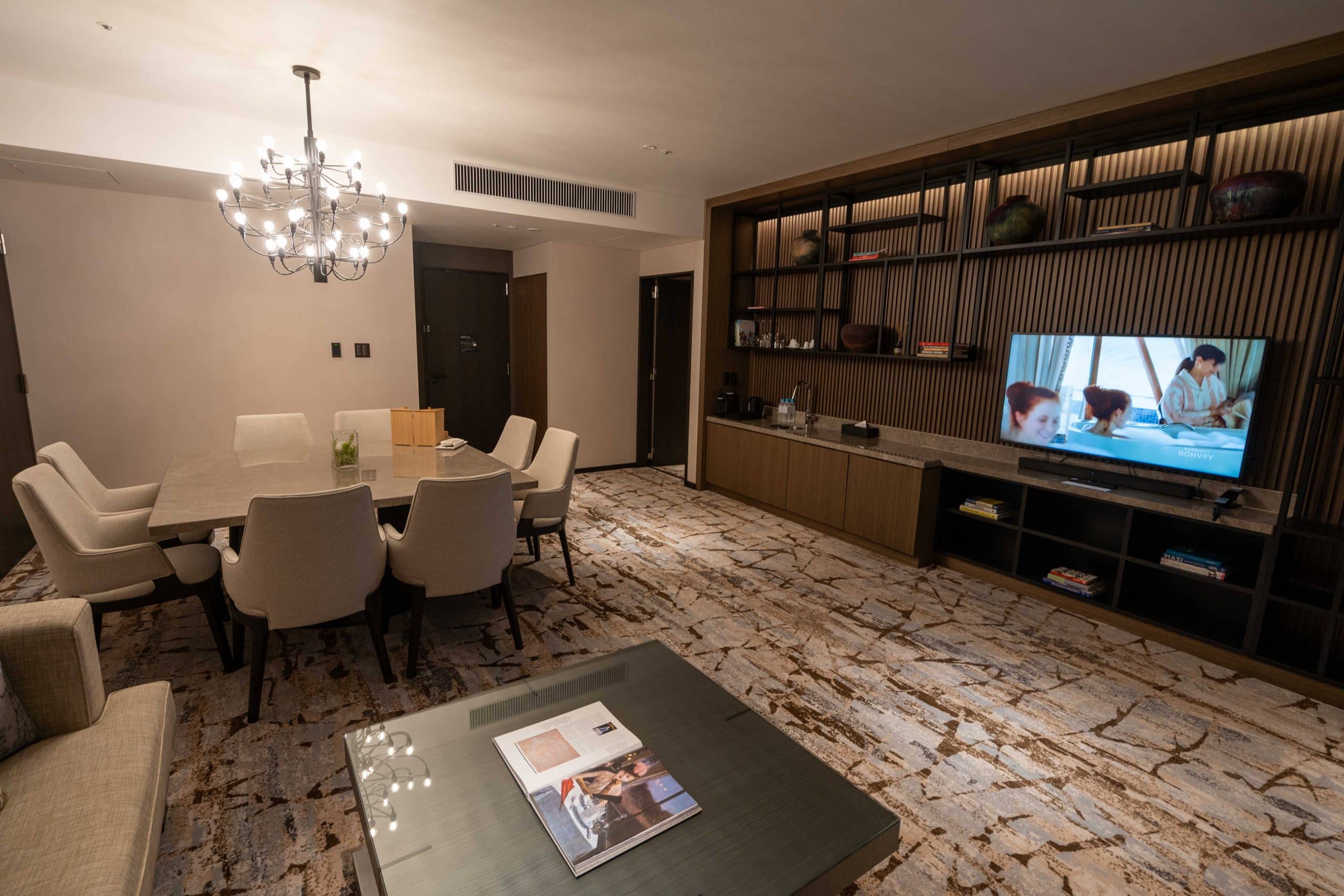 Turning our attention back to the suite’s layout, a flat-screen TV is mounted on the same wall, directly across from the seating area.