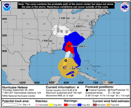 As of early afternoon Eastern Time on Thursday, September 26, 2024, a total of 1,038 flights had been canceled and 1,672 delayed according to flight tracking website FlightAware.