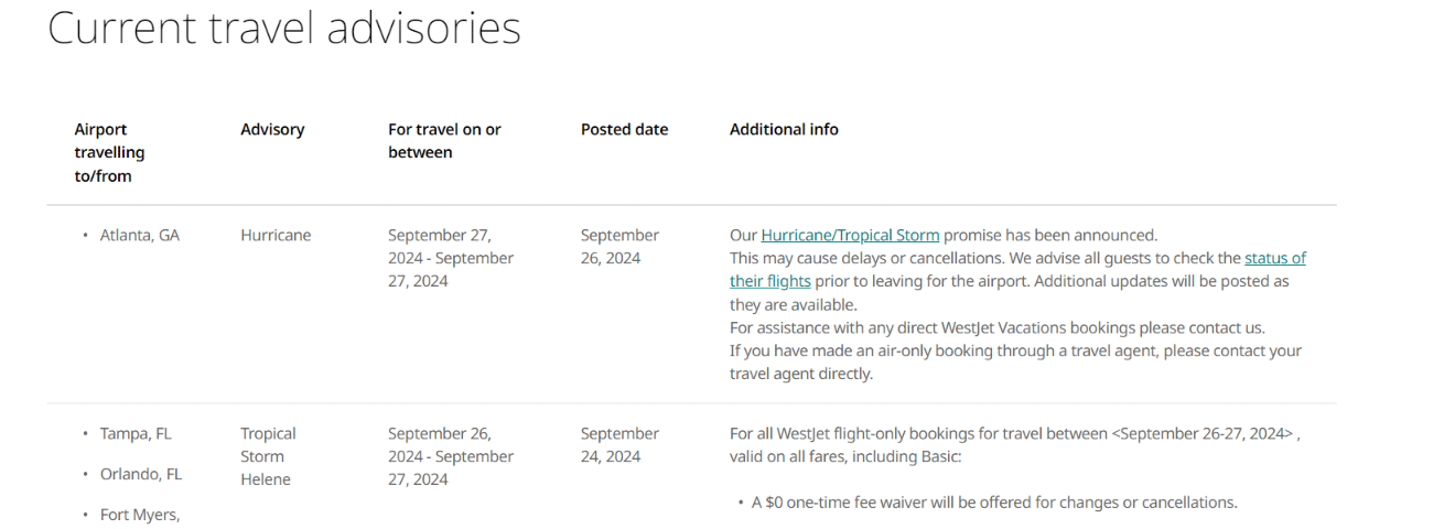 WestJet has also issued a travel advisory for Atlanta and parts of Florida, as well has activated its Hurricane/Tropical Storm promise.