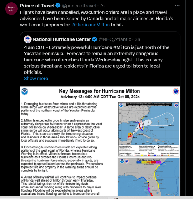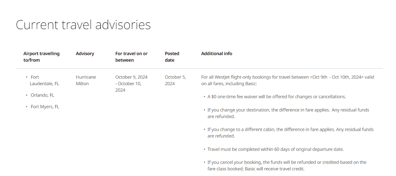 Meanwhile, Air Canada, WestJet, and Porter Airlines have all issued travel advisories to areas affected by Hurricane Milton, including Fort Lauderdale (FLL), Orlando (MCO), Tampa (TPA), and Miami (MIA)