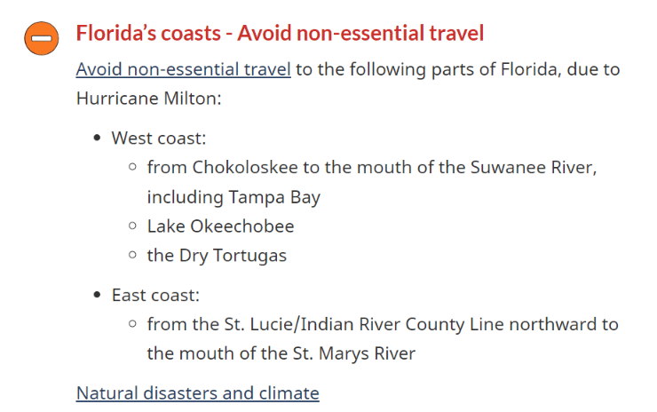 Canada has issued travel advisories for both Florida and Mexico telling Canadians to avoid non-essential travel along the west and east coasts of Florida, where Milton is expected to hit hardest. The travel warning has been heightened for Mexico, with Canadians being told to “avoid all travel” to the west and north coasts of the Yucatan Peninsula.