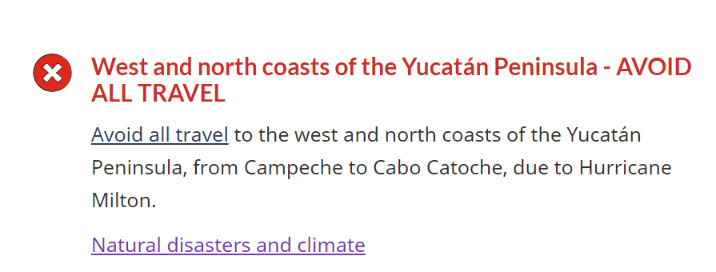 Canadians are being told to avoid non-essential travel to areas affected by the storm in Florida and parts of the Yucatan Peninsula.