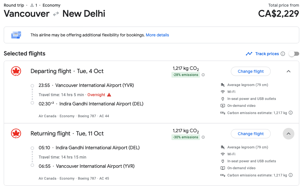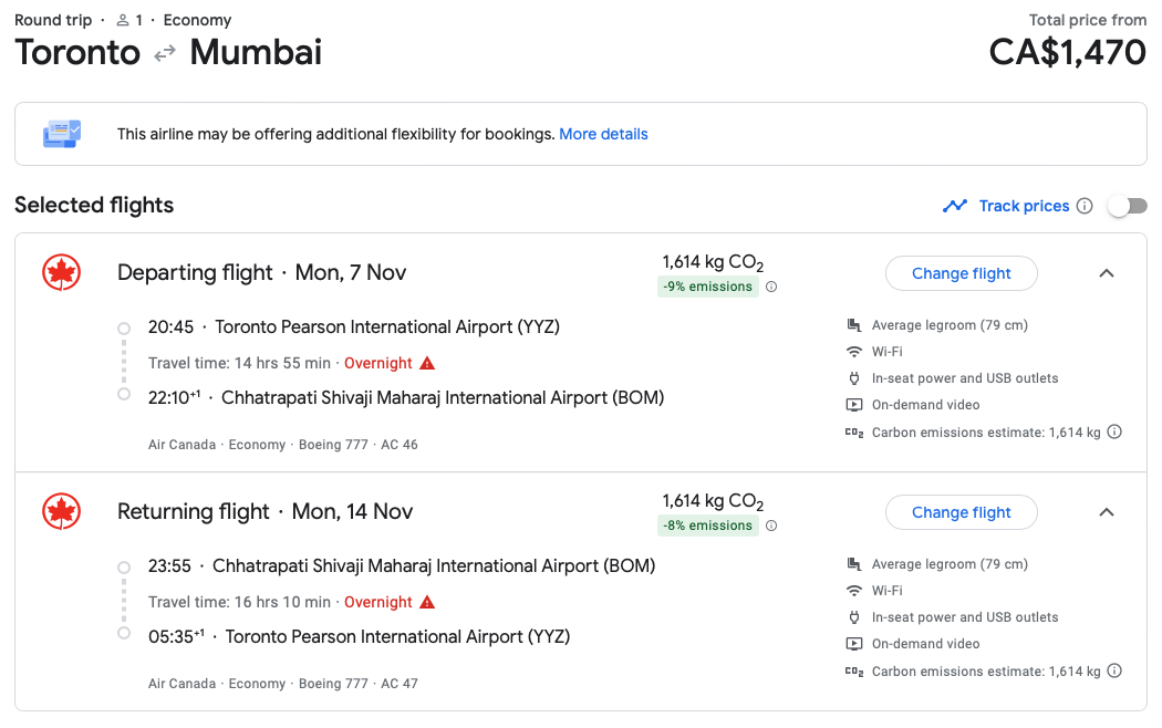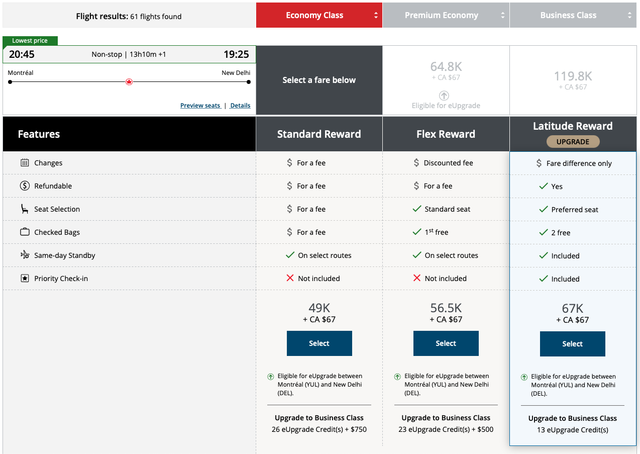 Cash fares in economy class to Mumbai are in the region of $1,500 (CAD), while fares to New Delhi are significantly higher from all Canadian departure points.