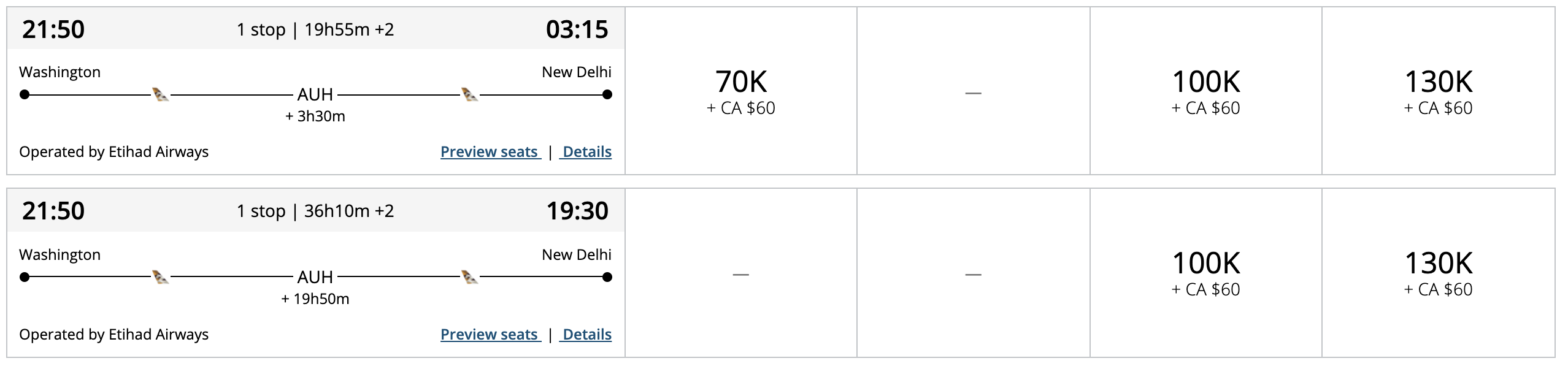 If you’d like to fly transpacific or through the Middle East on Etihad Airways, you’ll pay 100,000 Aeroplan points one-way in business class and 130,000 Aeroplan points in First Class.