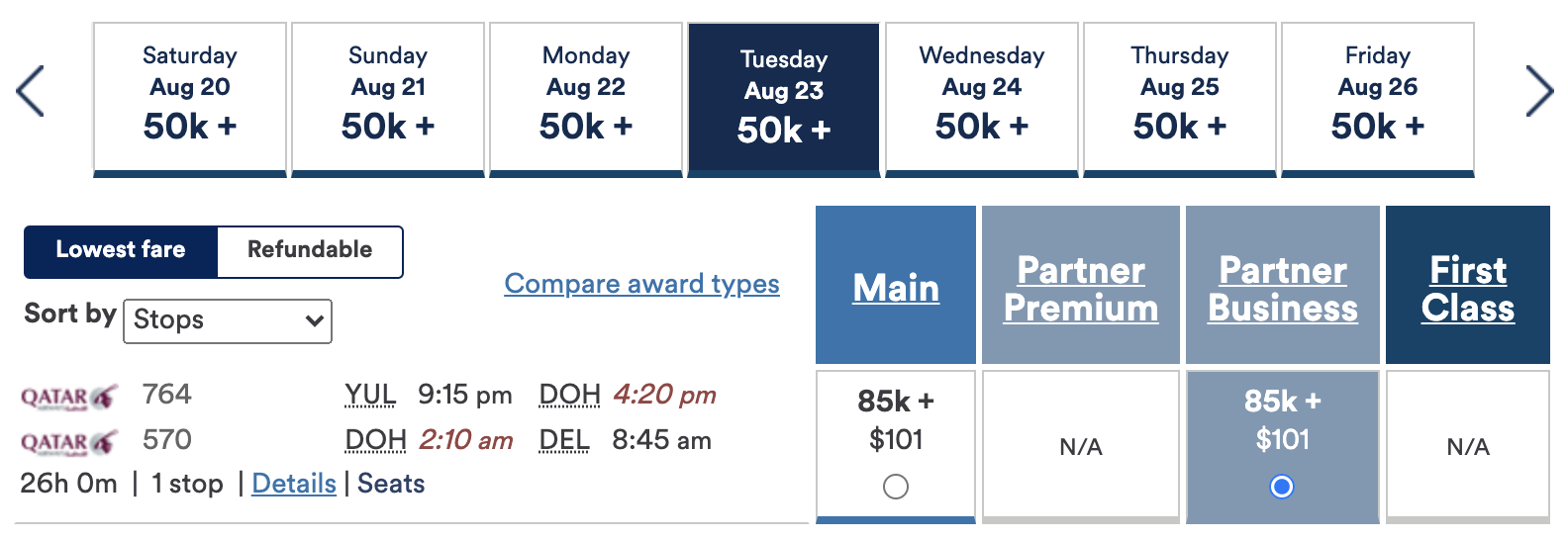 Lastly, with American Airlines AAdvantage, you can fly Qatar Airways Qsuites from North America to India via Doha for only 75,000 American miles.