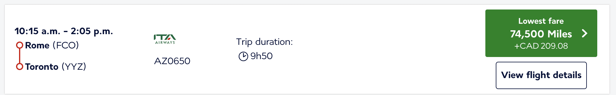 The cost in points is the same for a flight from Rome to Toronto, with marginally higher taxes and fees.