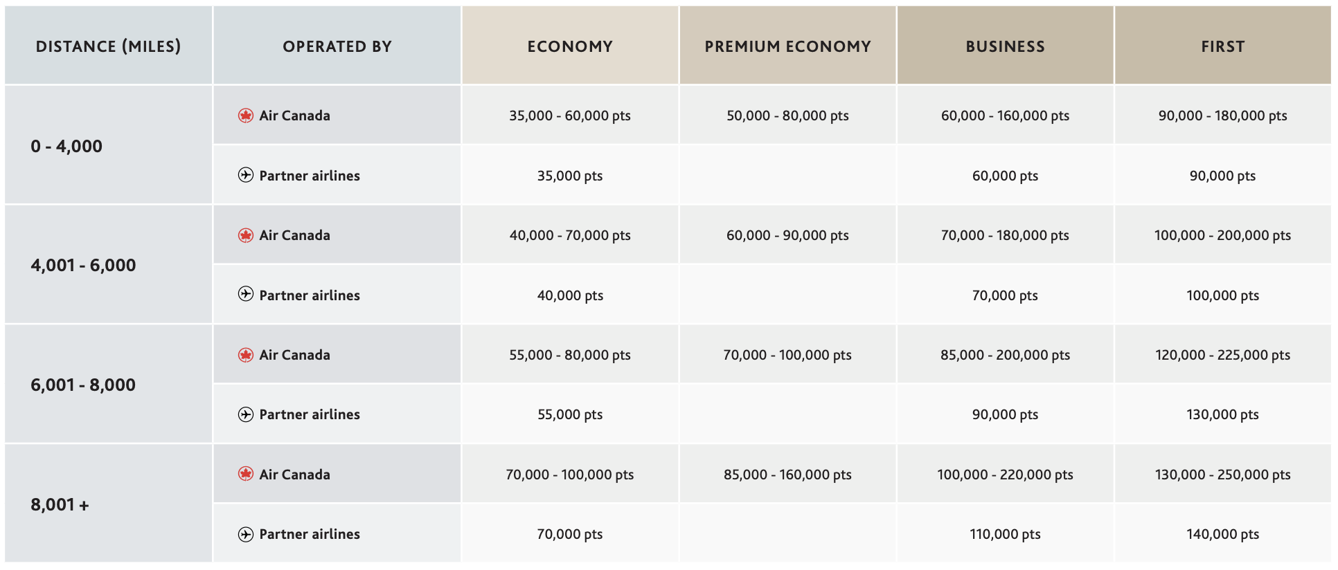 - Premium economy: 60,000–90,000 points