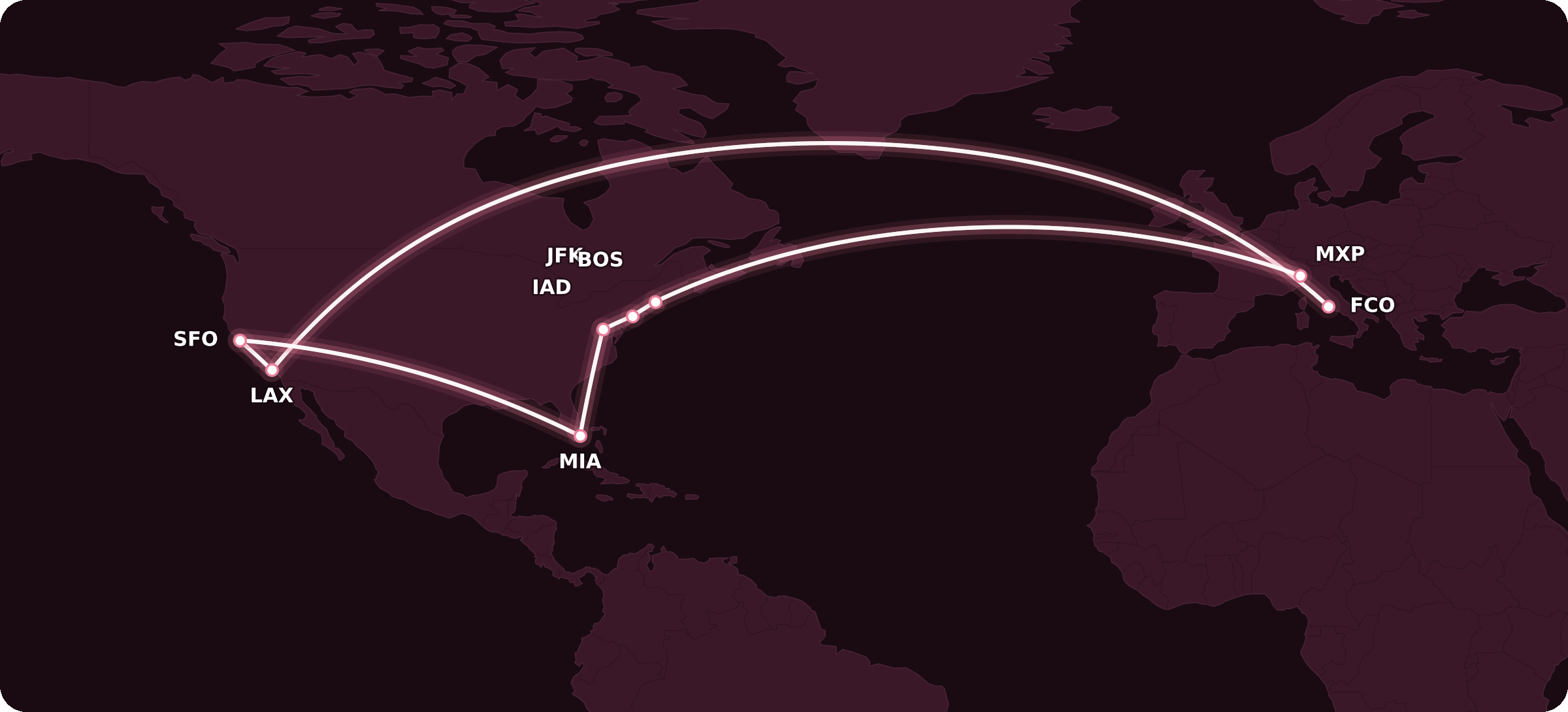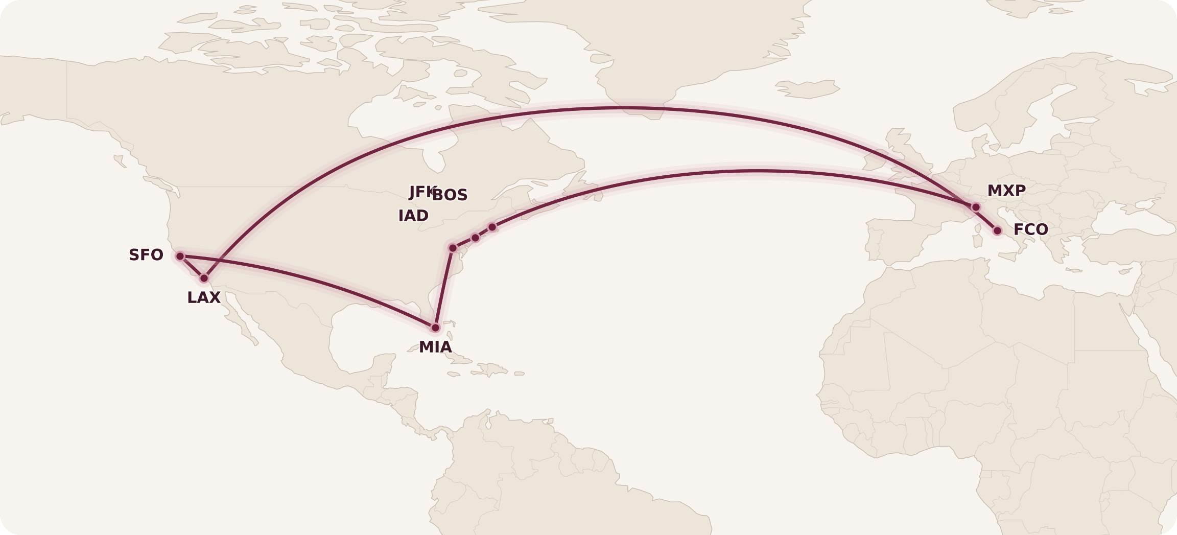 On the West Coast of North America, ITA Airways flies to both Los Angeles (LAX) and San Francisco (SFO). On the East Coast, ITA Airways services Miami (MIA), Washington (IAD), New York (JFK), and Boston (BOS), all from Rome (FCO).