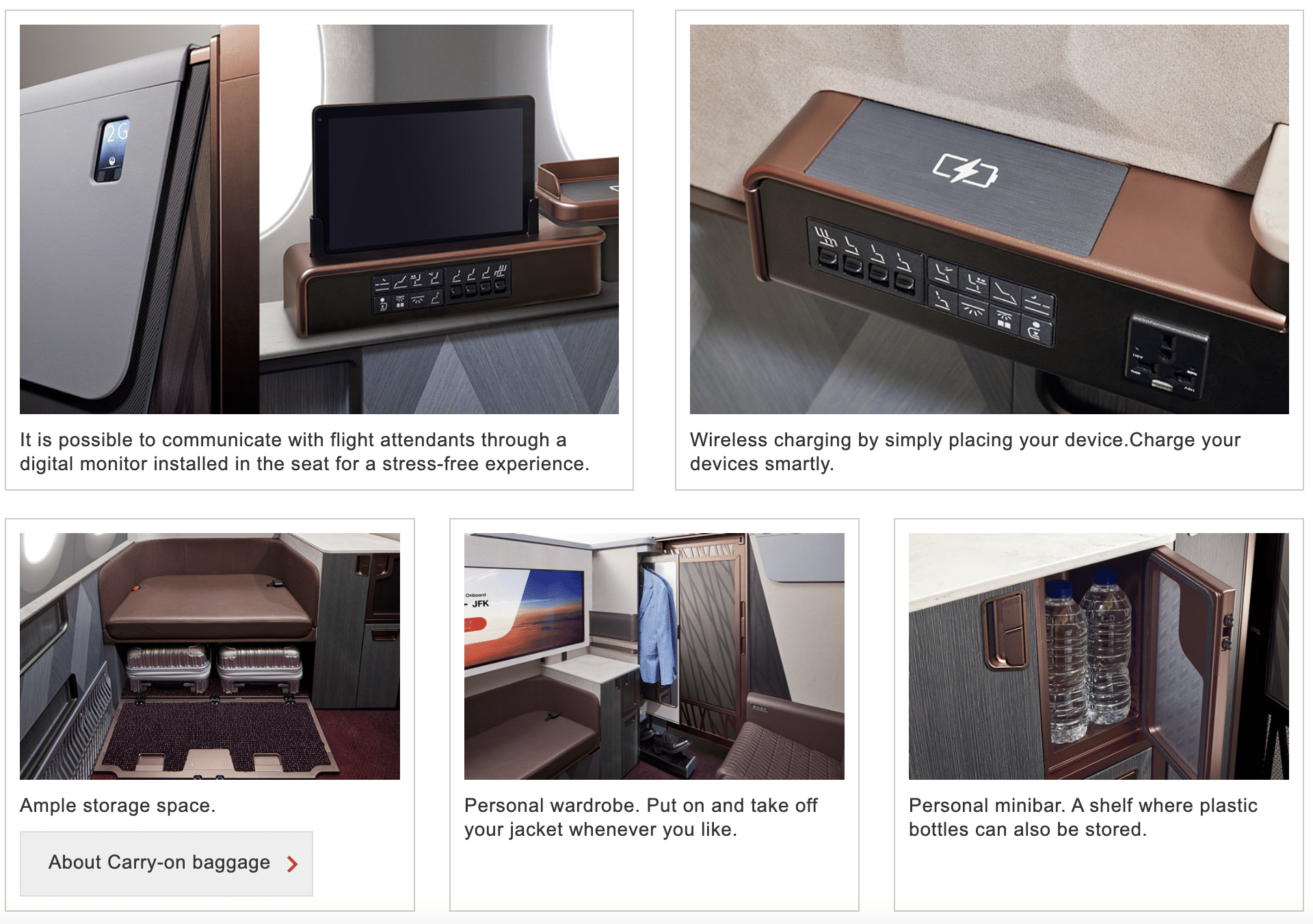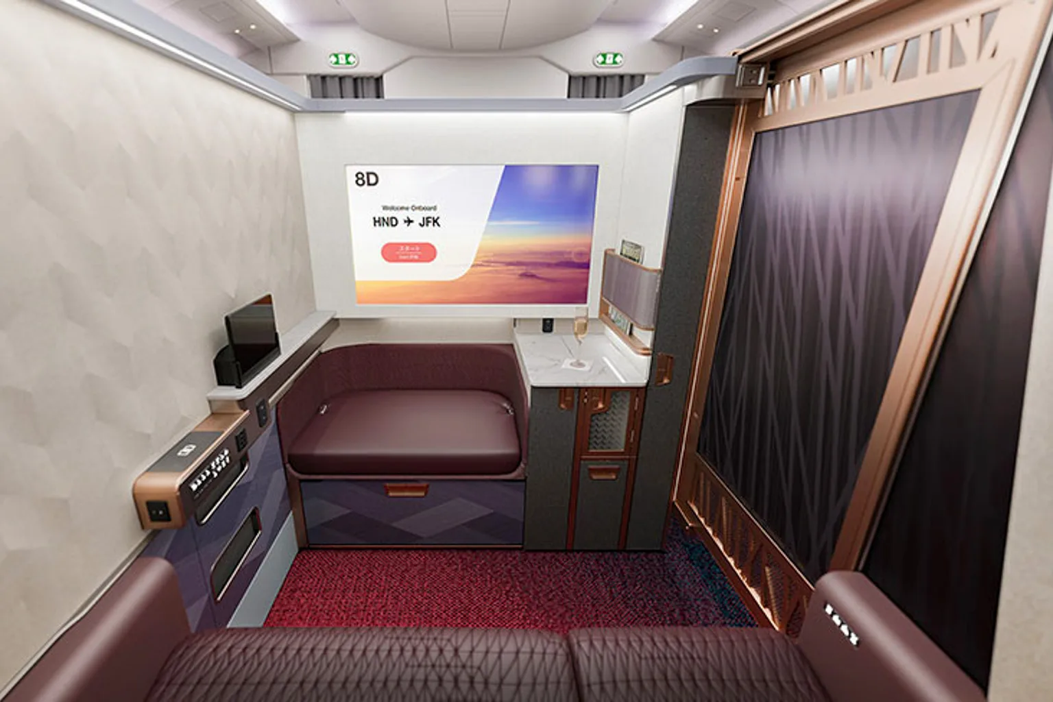 Other key features of the new Japan Airlines First Class experience include an in-suite minibar, a monitor for communicating with the crew, and wireless charging capabilities.